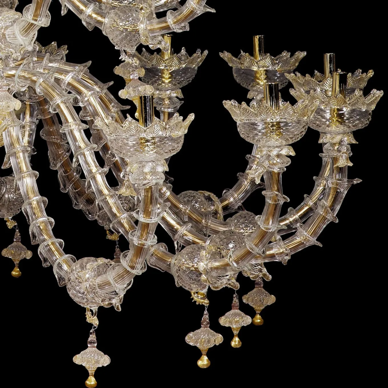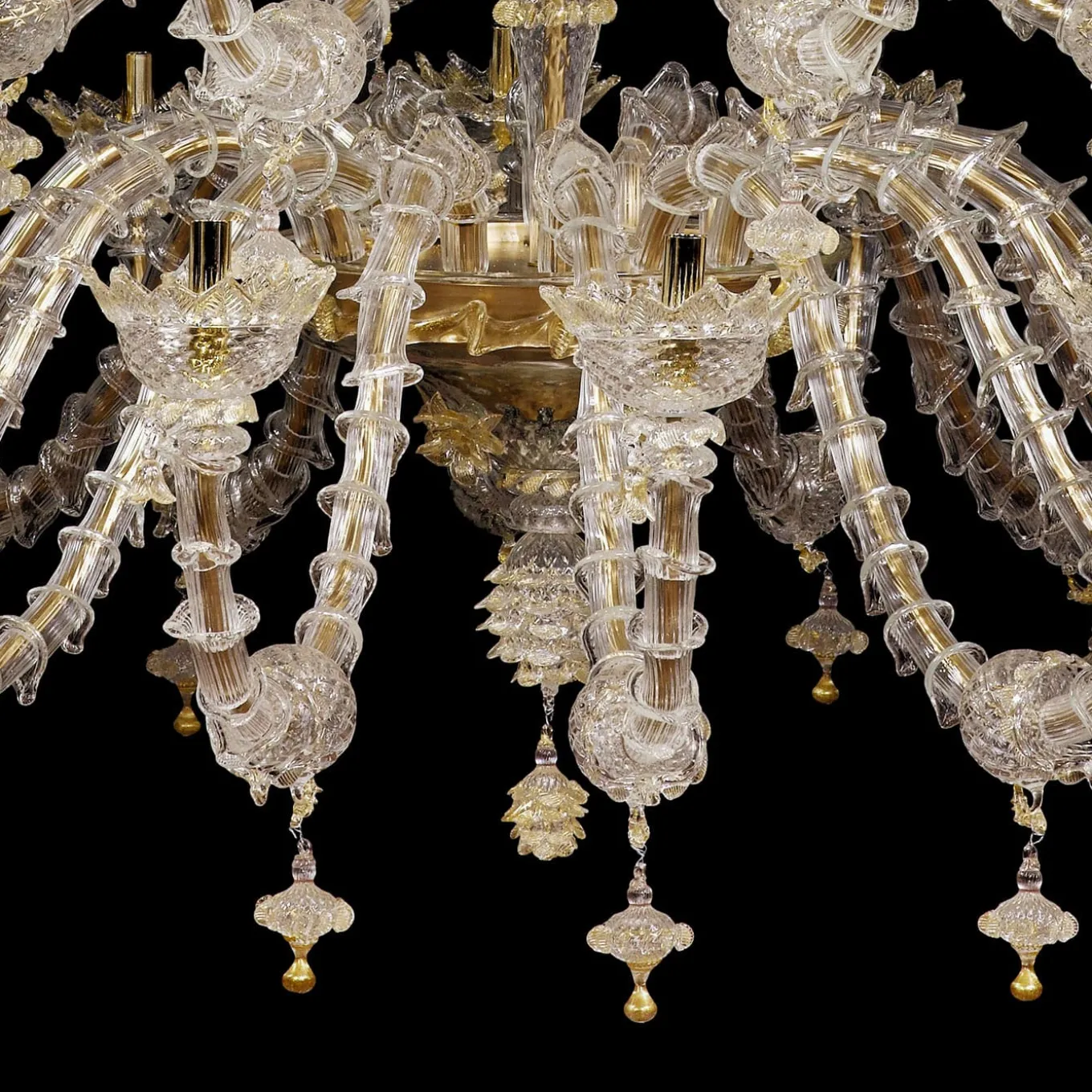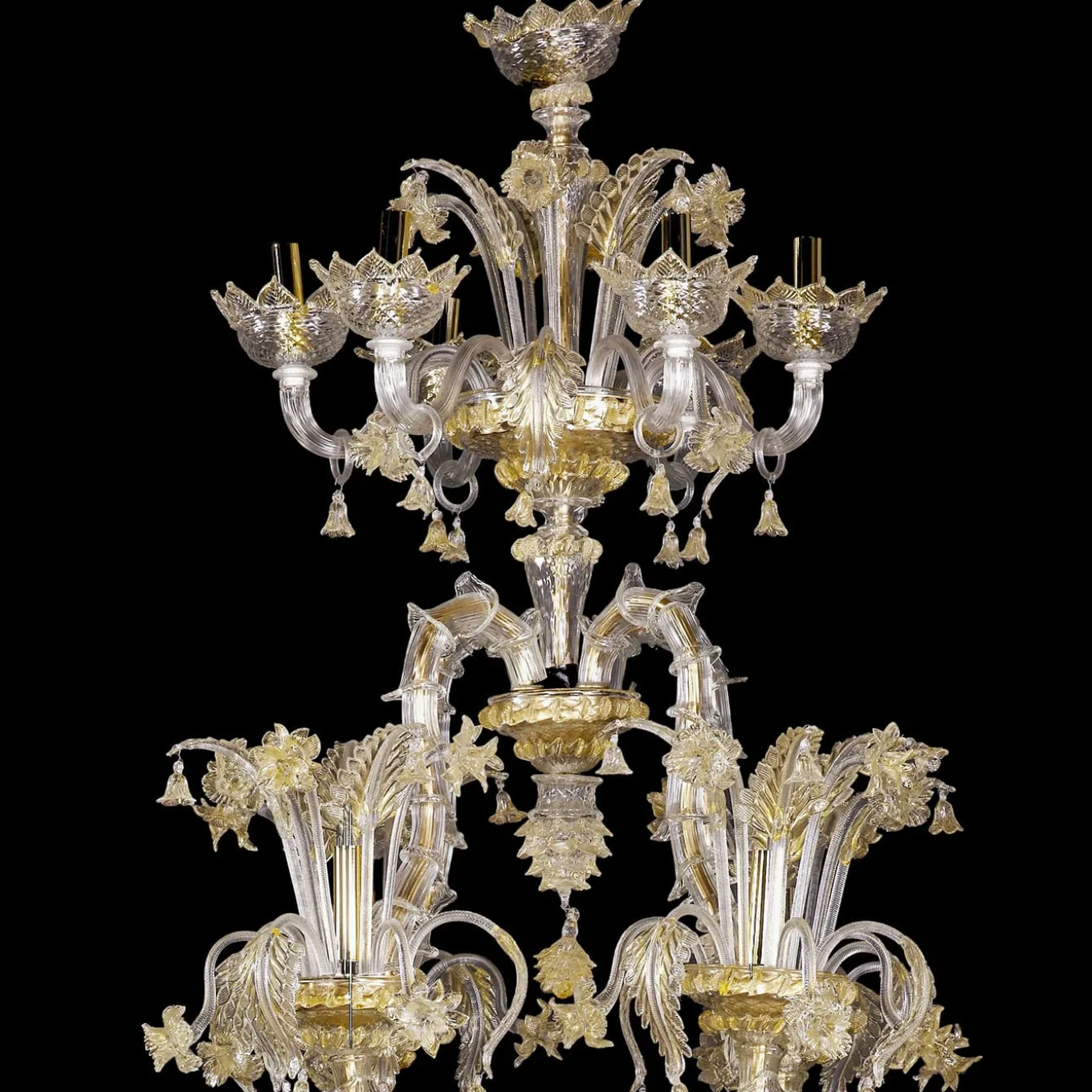 A lavish and precious, stately accent piece for a refined interior setting, this stupendous Rezzonico-style chandelier is comprised of 42 E14 lights arranged on a four-level metal frame. Deftly handcrafted by expert artisans of mouth-blown Murano glass following ancient techniques such as the rigadin, which creates lengthwise textured striping on the glass, it is decorated with crystal and golden details including leaves, flowers, cups, and curls. Suitable for LED lightbulbs.