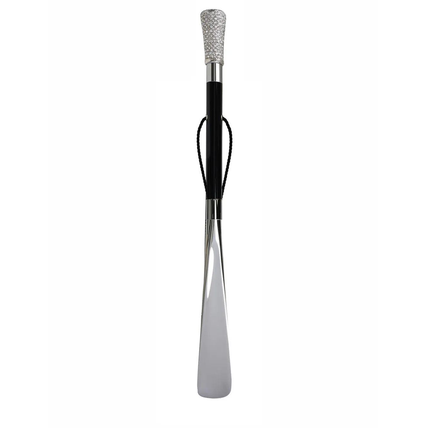 Harmonious lines and glamorous details make this artisan shoehorn ideal for easy slipping into shoes in style. The silvery ABS paddle and the silver-finished metal handle studded with rhinestones are linked through an elegant beech shaft lacquered in black with a polished finish, silver-finished brass rings ensuring the necessary steadiness. Equipped with a loop for easy hanging, the design comes with an exclusive branded case.