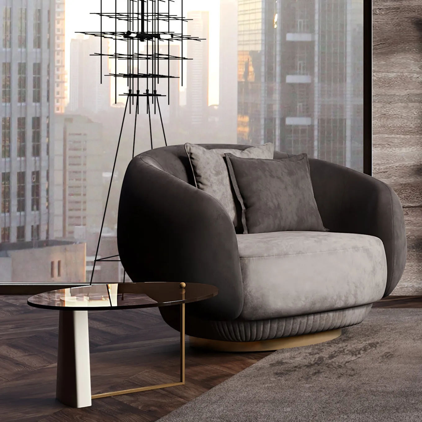 An exercise in contrasts and balances given by the brilliant juxtaposition of different materials and textures, this stunning set of two coffee tables will add a luxe accent to a contemporary interior. Defined by a minimalist, clean-lined style, both pieces feature a sturdy wooden leg and a flat-bar, L-shaped metal leg, supporting a round bronzed glass top. Please consult the Concierge for customizations and finishing options.