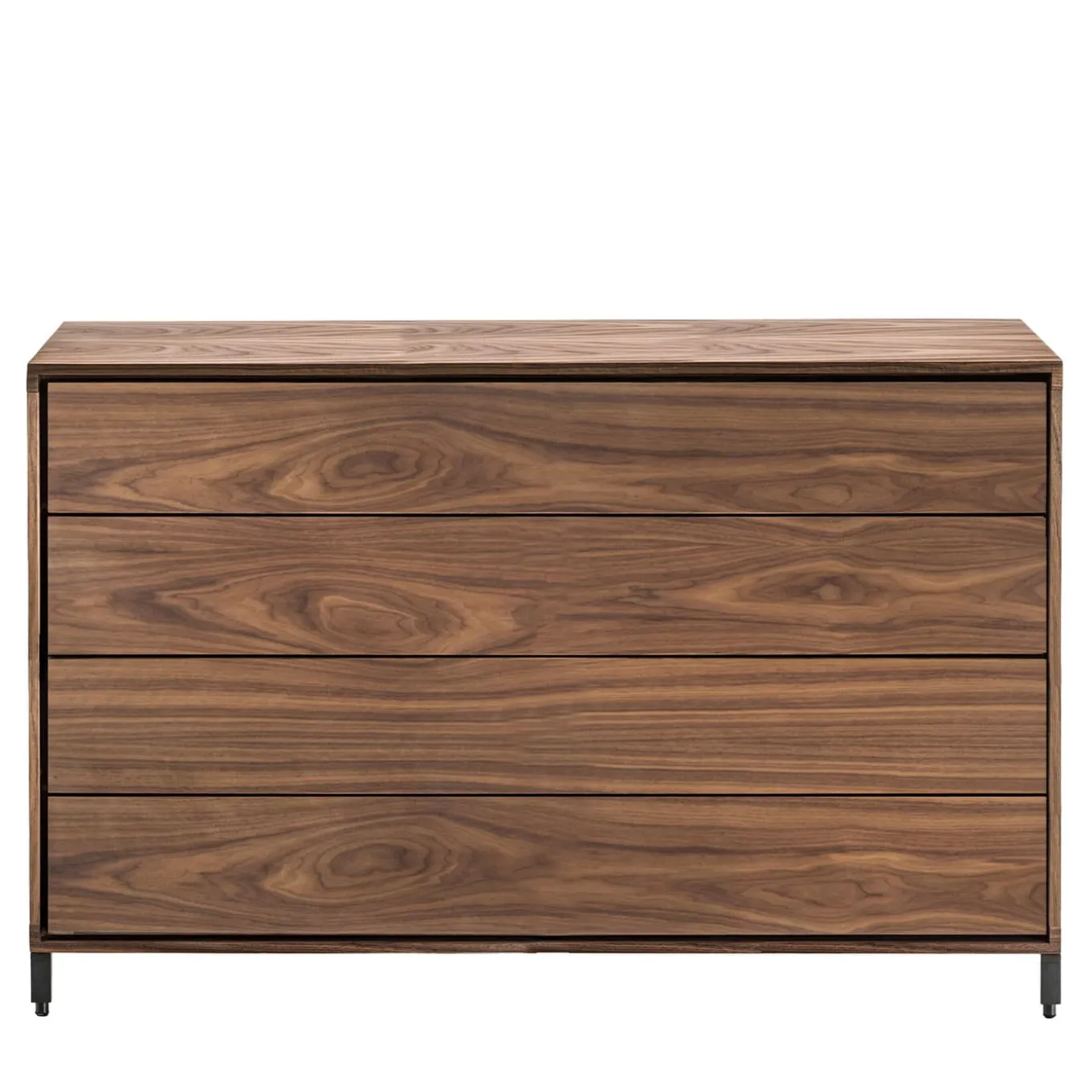 The simplicity of a minimalist design meet in this dresser the charm of unique swirls drawn by nature. Crafted of fine oil-finished walnut and raised on tiny anthracite-gray-lacquered iron feet, its structure results perfectly flat, a characteristic favoring to focus on its splendid natural woodgrain. The grooved design of the four drawers’ handles contributes to this purpose.