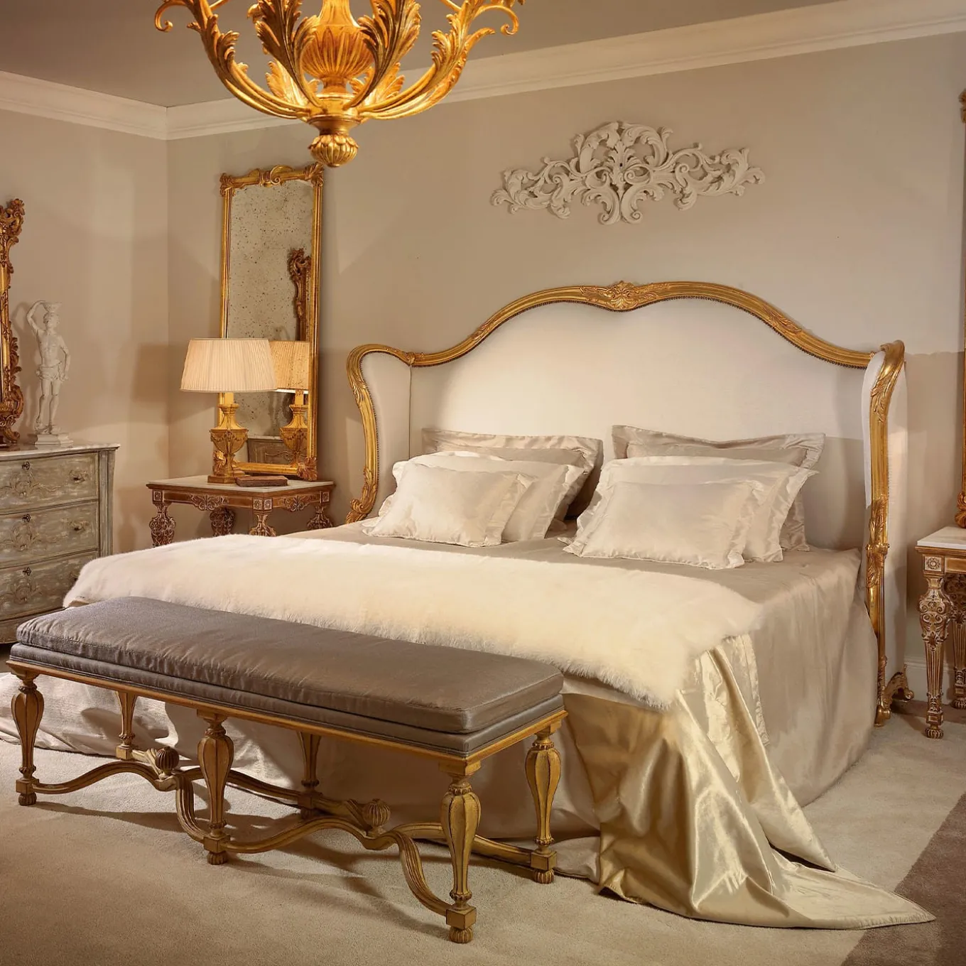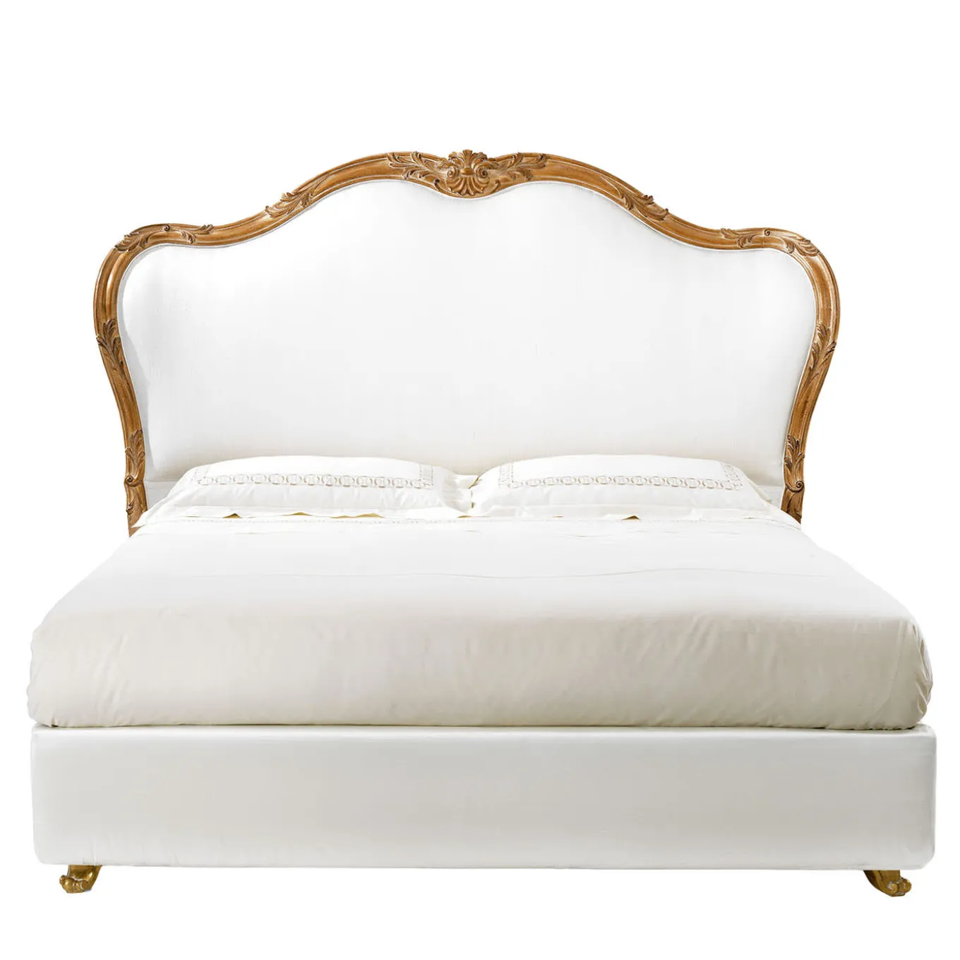 The Rialto Bed features a hand-carved solid wood headboard, gilded with gold leaf (G079), complemented by a fully upholstered sommier and matching gilded wooden feet. The white satin upholstery enhances its elegance, with other color options available. Inspired by 18th-century Venetian style, it fits a 180x200x25 cm mattress (not included) and is also available for 170×200 and 200×200 sizes. Bedding not included. Contact the concierge for additional information.