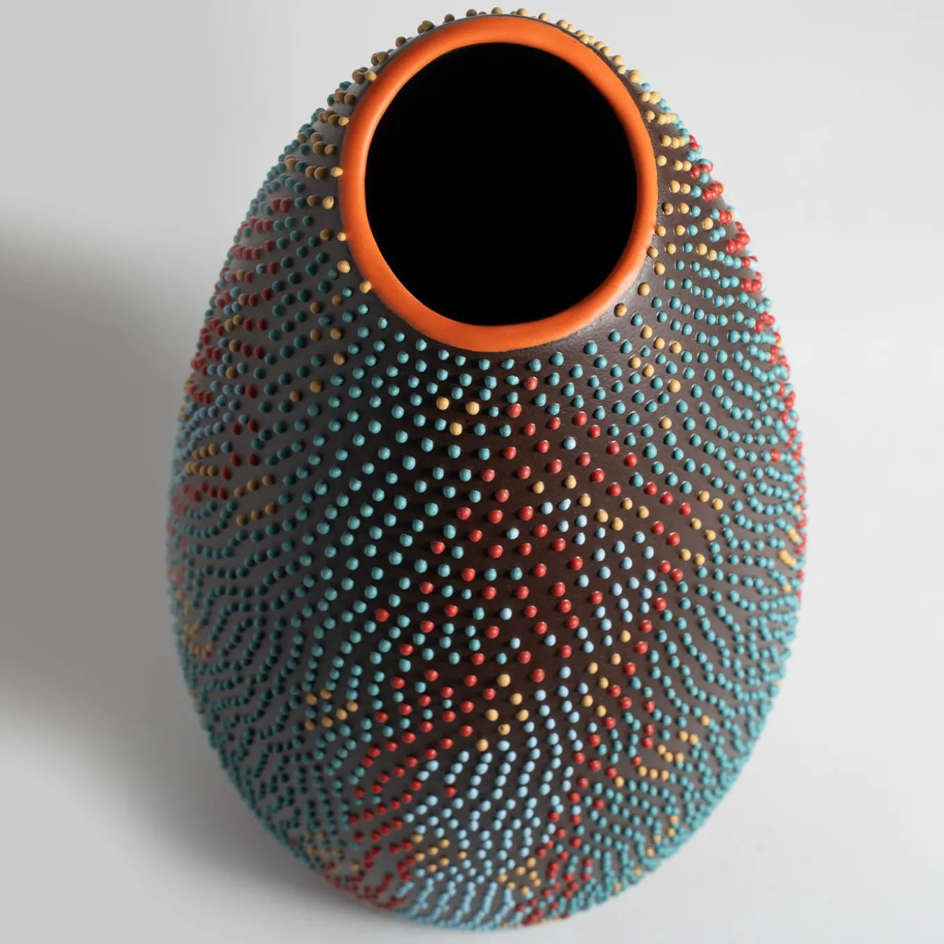 Marked by a bulging silhouette tapering to a narrow mouth accented in vibrant orange, this ceramic vase is a triumph of colors and hypnotizing details. The silhouette of a chameleon emerges from the thoughtful distribution of the different-color dots the exterior is extensively studded with. Painstakingly painted by hand, each vase is a unique and unpredictable work of art.