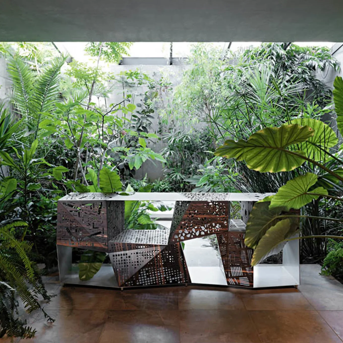 Designed by Steven Holl, this captivating and stunning sideboard is a sculptural objet d’art, exquisitely crafted with meticulous attention to details. It comprises an aluminum frame enclosing five containers of different geometric shapes, equipped with opening doors with a magnetic system, and boasting a unique allure obtained with 2mm-thick layers of fine ebony wood accurately laser-cut and folded in an origami-like silhouette, thanks to the advanced technological techniques provided by Horm.