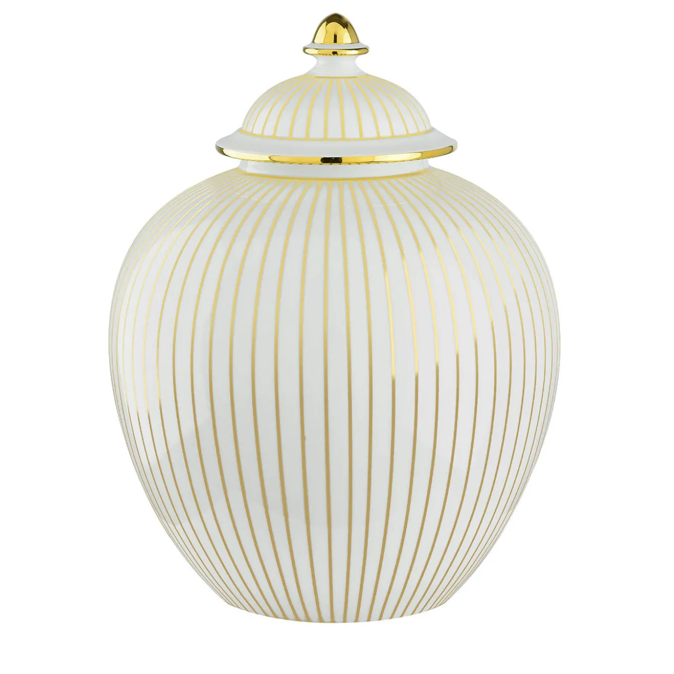 Pinnacle of classic elegance, this precious potiche crafted of fine white porcelain will give a distinctive luxe allure to dining tables or sideboards. The inherent luminosity of the porcelain is emphasized by a lavish pattern of thin vertical stripes in brushed gold adorning the entire silhouette including the convex lid, which boasts border and dainty finial accented in glossy gold.