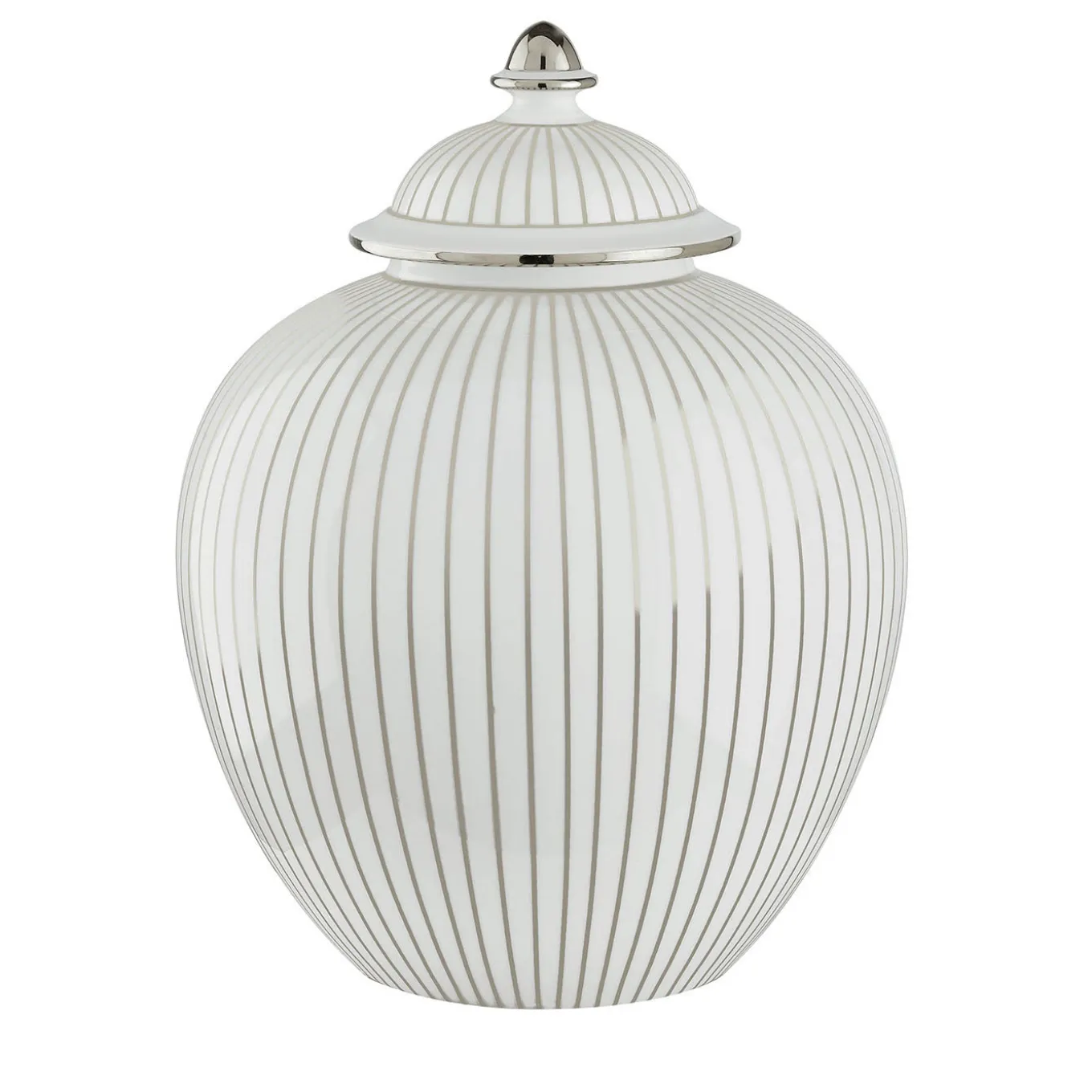 In this superb potiche, the vulnerable beauty of porcelain meets the undying nature of platinum, resulting in a combination of rare elegance. Part of the Righe Collection, the piece is defined by a bulging and welcoming silhouette equipped with a convex lid, the two flaunting the same delicate design of vertical platinum stripes. The lid’s border and finial are accented in glossy platinum as exquisite sealing details.
