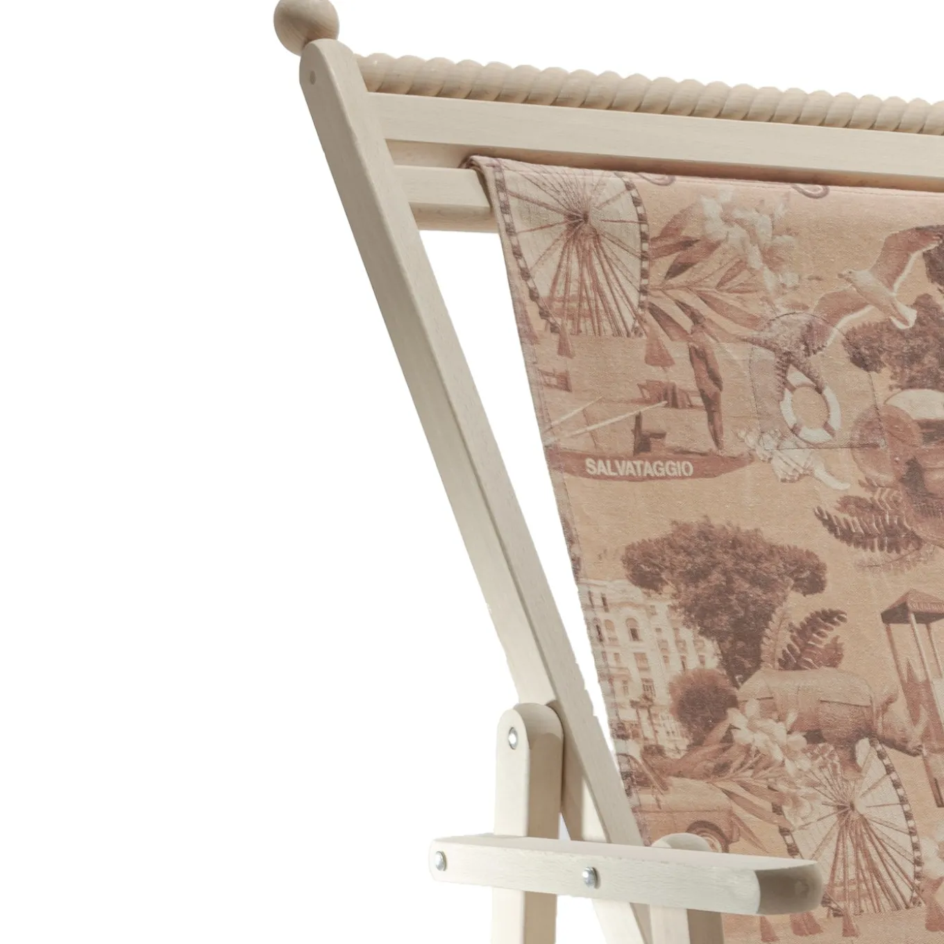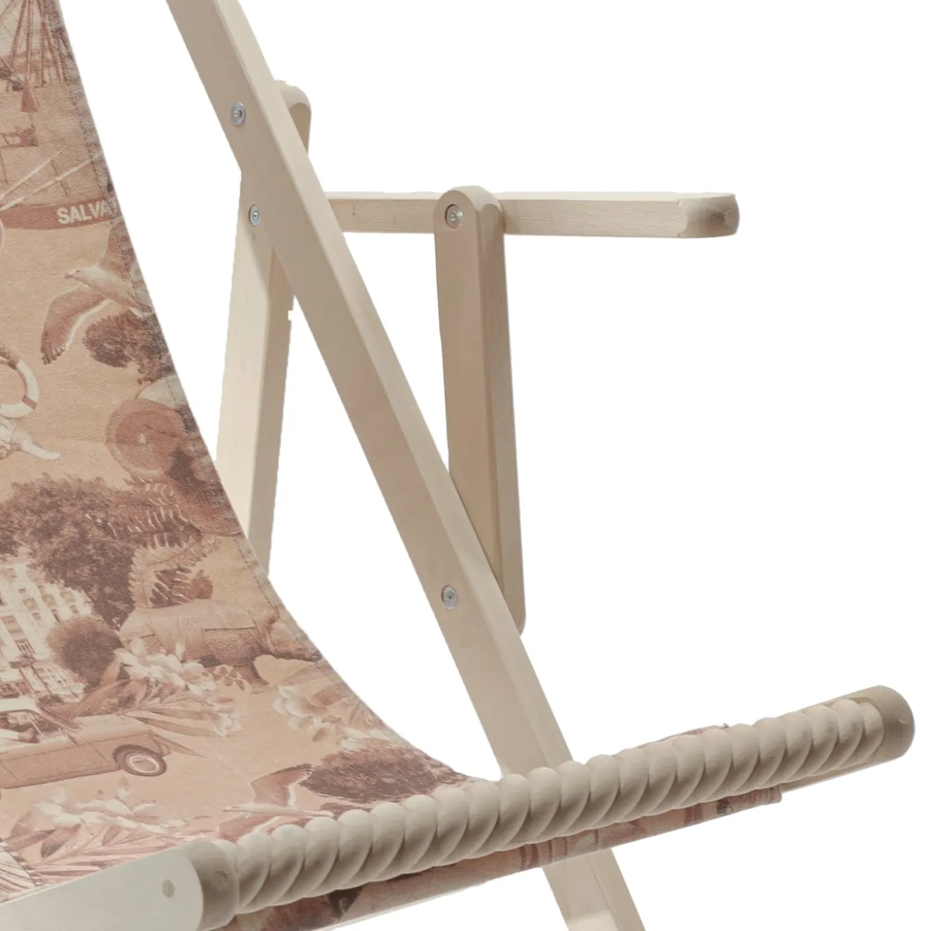 A folding deck beech chair in solid beech wood is distinguished by the inlay of friezes and moldings in turned wood. The backrest is adjustable in four positions. Printed cotton fabric with Rimini graphics, including stitching and buttonholes for inserting the wooden fixing sticks. The untreated raw natural beech will age like other raw materials.
