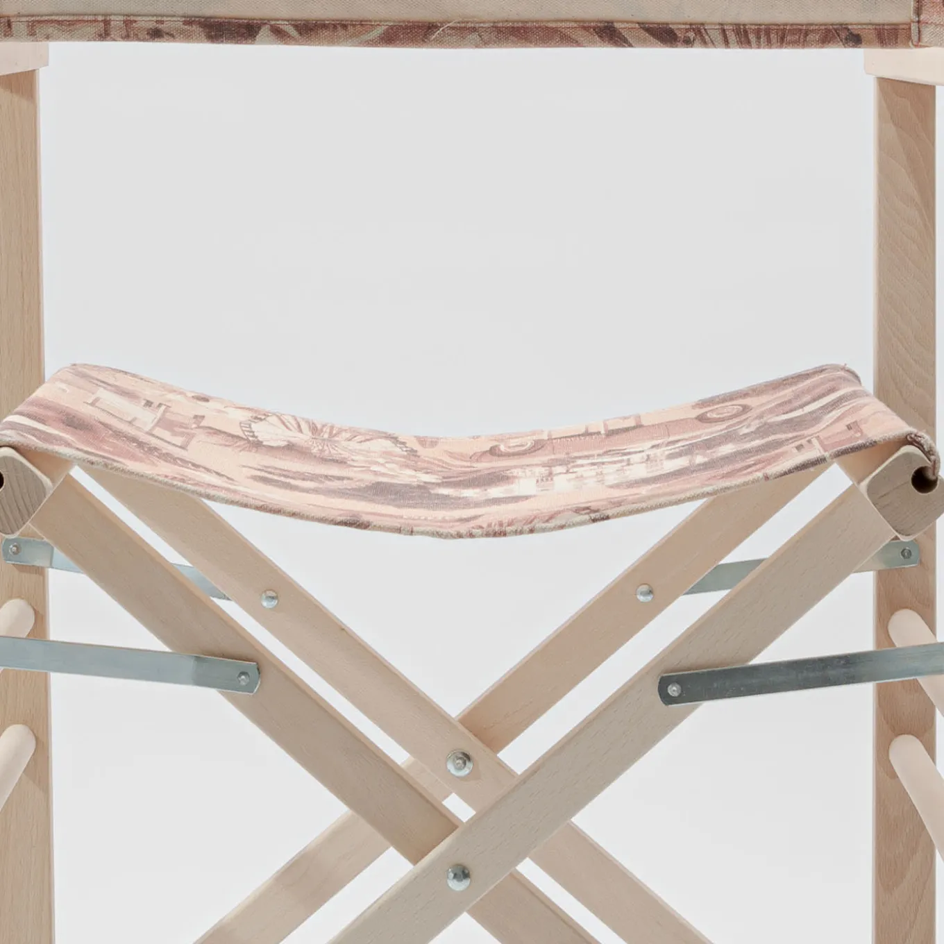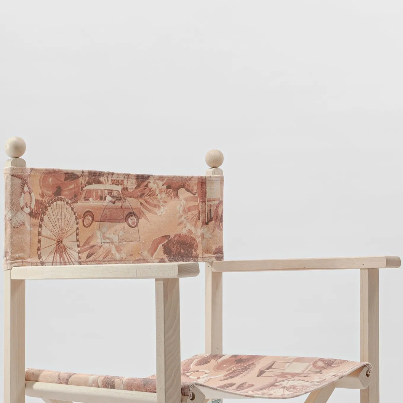 Folding director’s chair in solid beech wood characterized by the insert of friezes and moldings in turned wood. Printed cotton fabric with Rimini graphics including stitching and buttonholes for inserting the wooden fixing sticks.