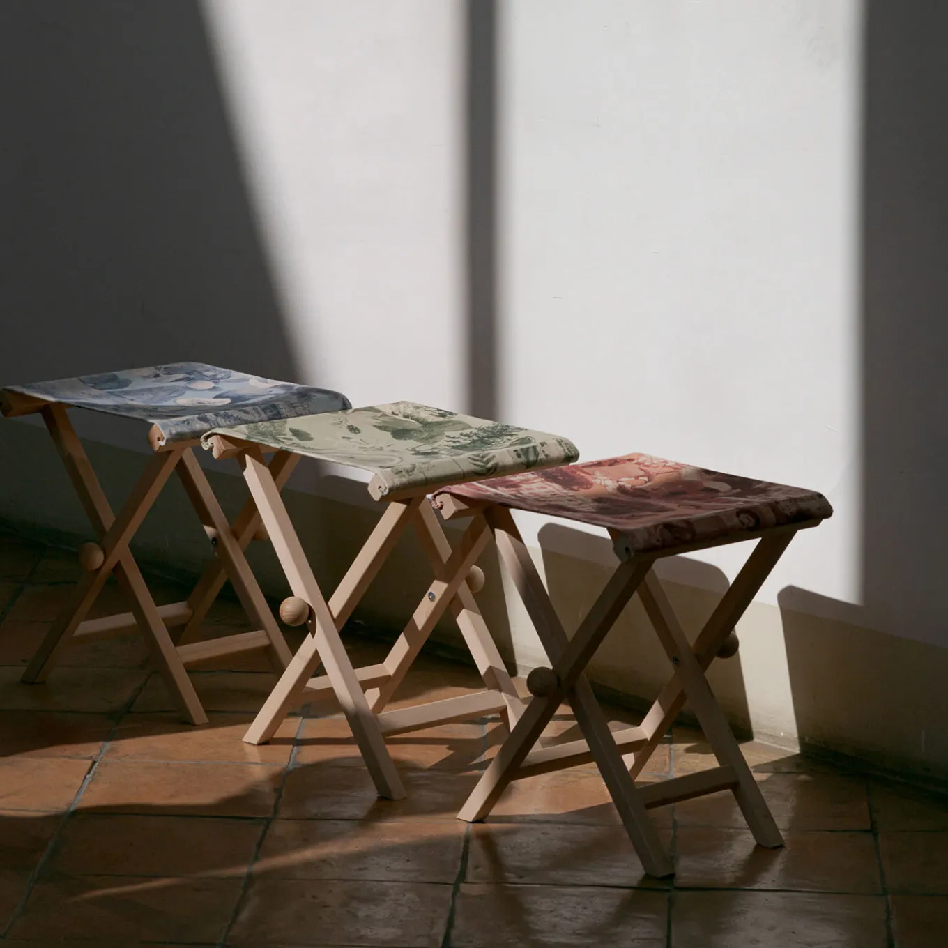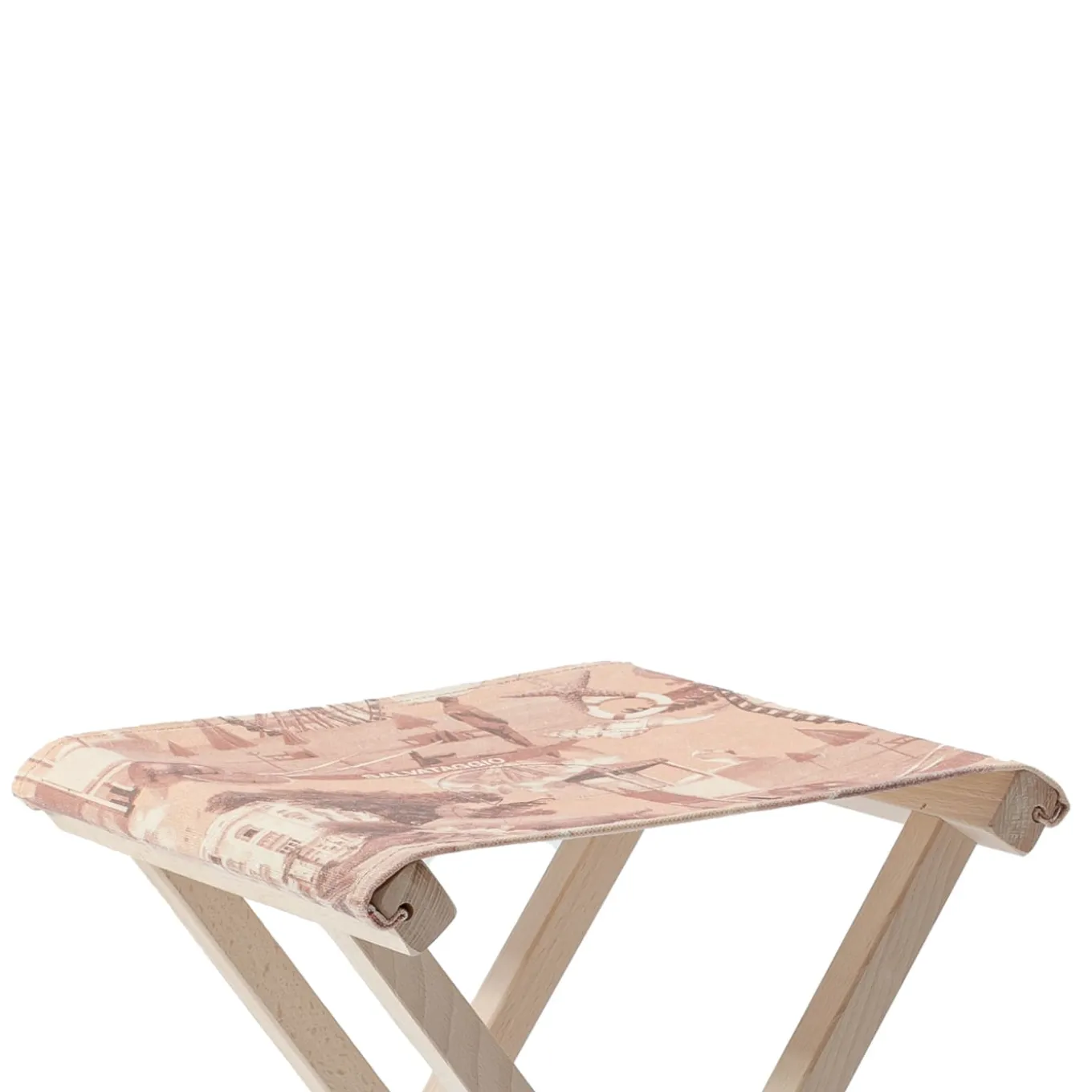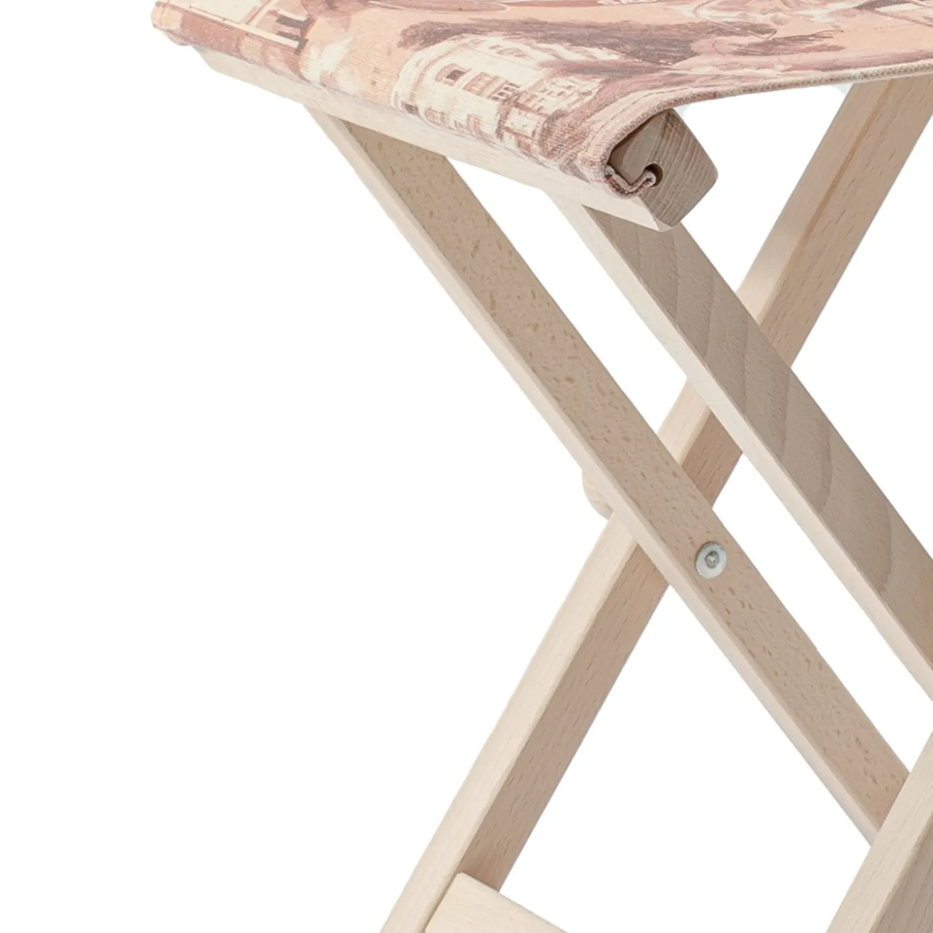 A folding low stool beech chair in solid beech wood characterized by the insert of friezes and moldings in turned wood. Printed cotton fabric with Rimini graphics including stitching and buttonholes for inserting the wooden fixing sticks. The raw natural beech, not treated, will age like all raw materials.