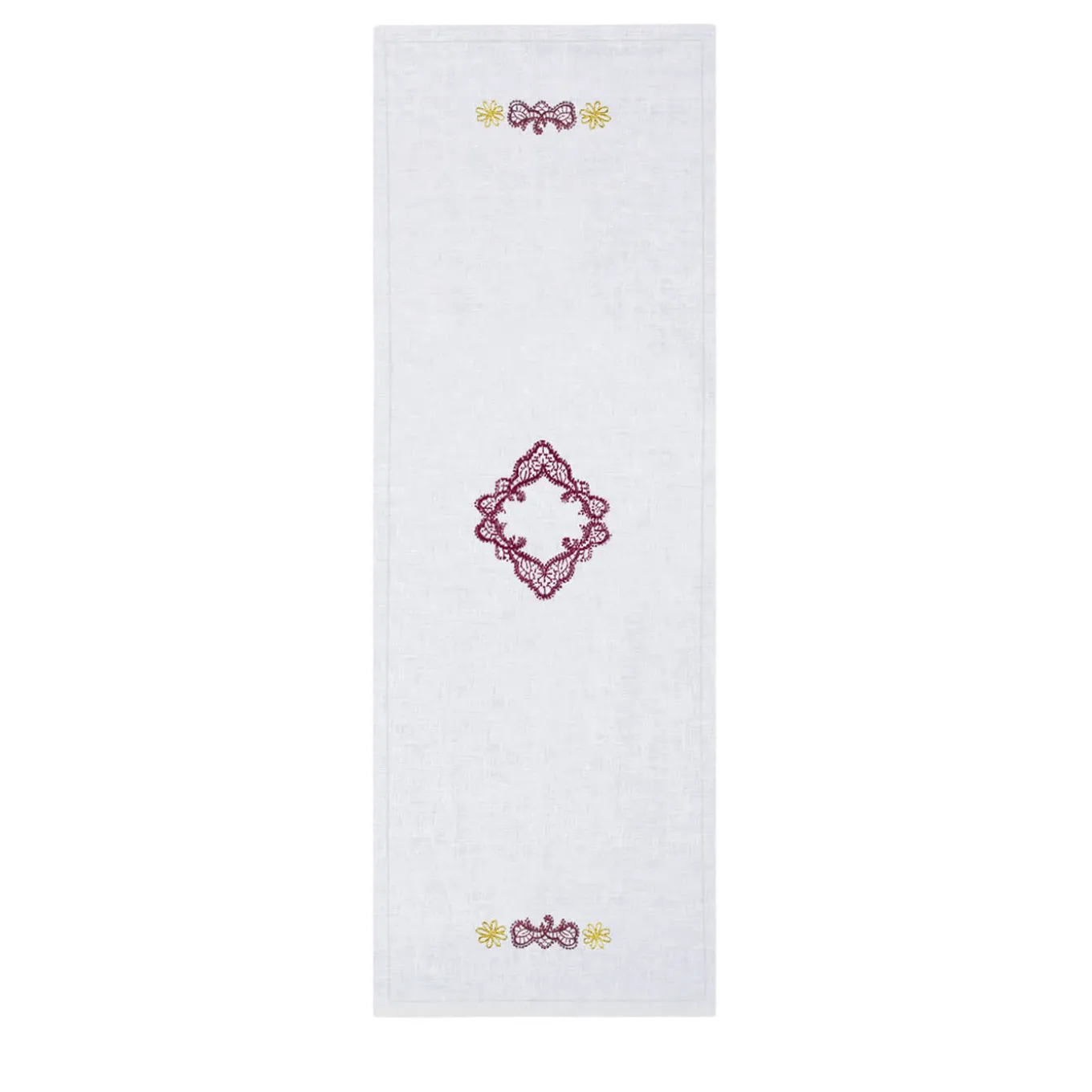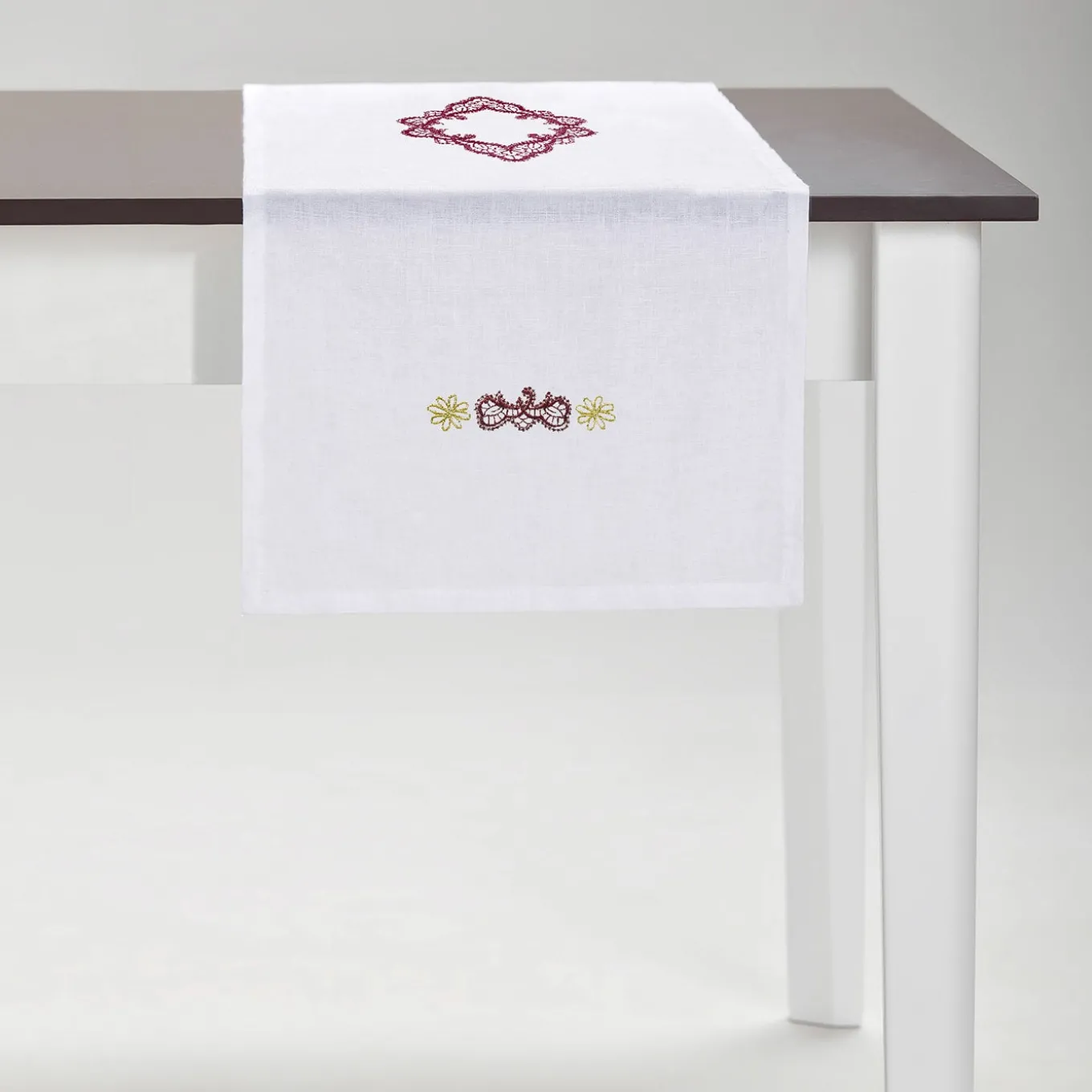 Drawing inspiration from Apulian traditional lace designs, minute manual embroideries in Mako cotton emerge vibrant against the pure whiteness of this linen table runner. Long hours of painstaking manual work are behind every piece, which is a celebration of local craftsmanship sure to accent any table with unfailing sophistication. Multiple color versions are available in the Artemest catalog.