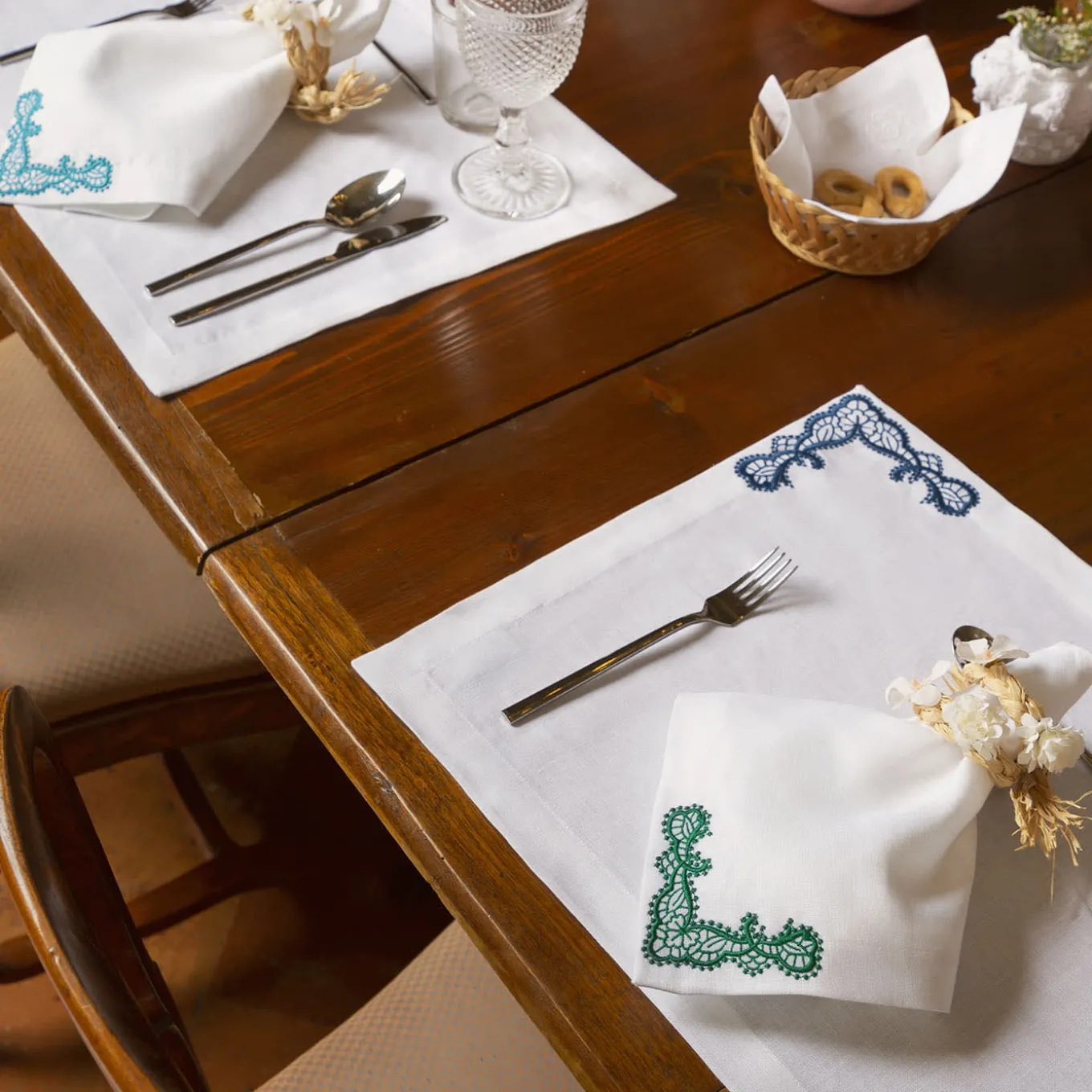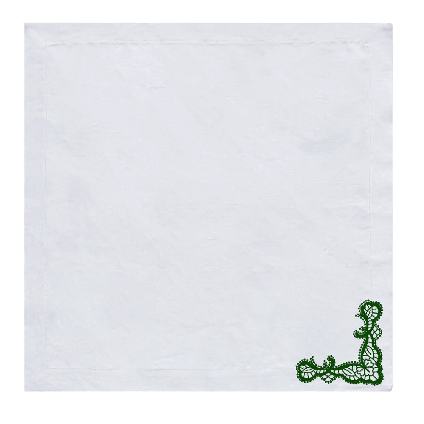 A testament to Apulian weaving traditions, this set of two napkins in fine bright-white linen makes for a refined addition to classic or contemporary tables, alike. The dainty Mako cotton corner embroidery is inspired by local lace designs, its green tone neatly contrasting with the white backdrop. Multiple color options are available in the Artemest catalog.