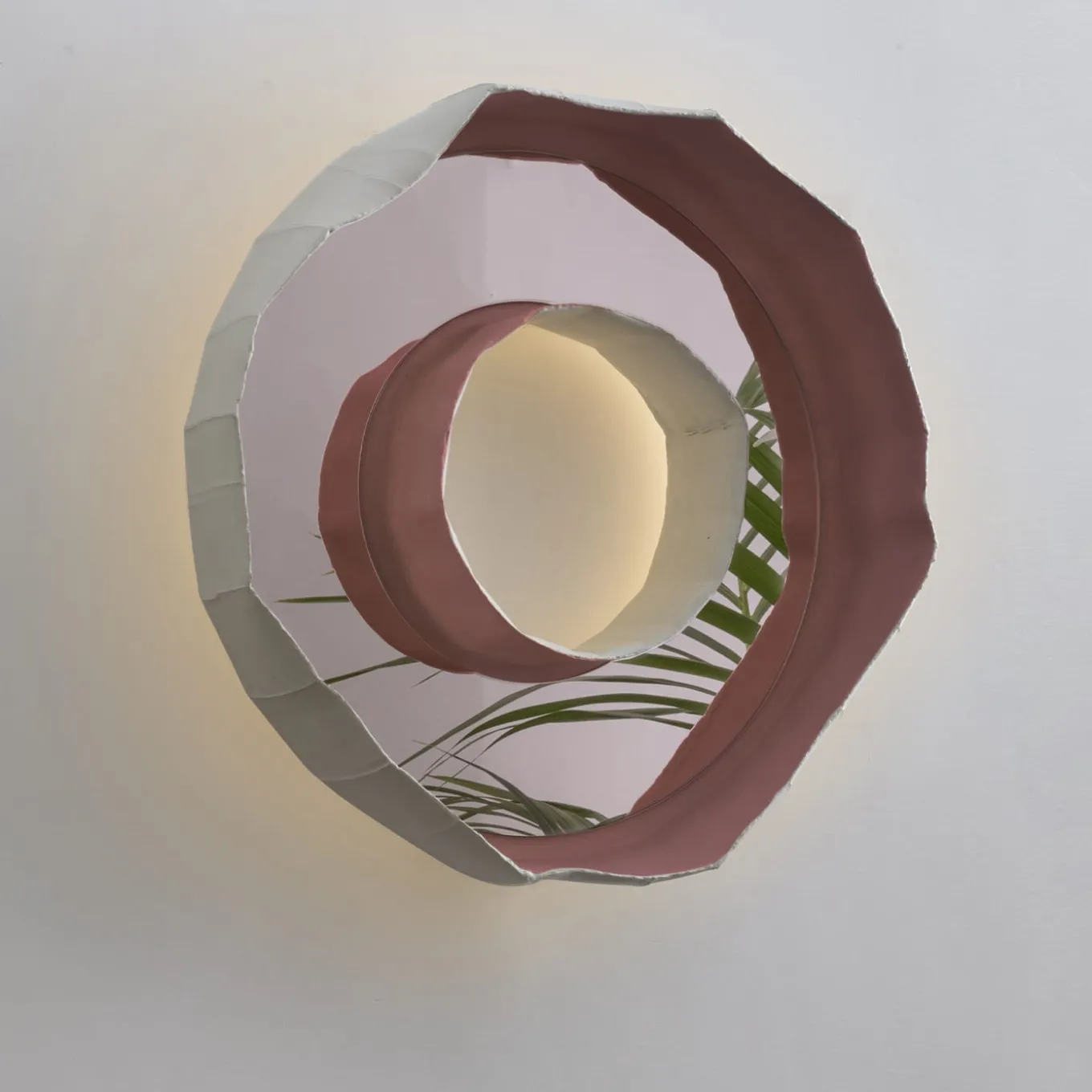 Reflections, a concept that embraces the double meaning of the word, is the title and theme of the collaboration between Paola Paronetto and Giovanni Botticelli. This new collection is the result of the encounter between Paola Paronetto’s Cartocci and Giovanni Botticelli’s work with glass and mirrors, a fusion of distinctive materials developed by their creators, which combine thanks to their aptitude for color and formal clarity.