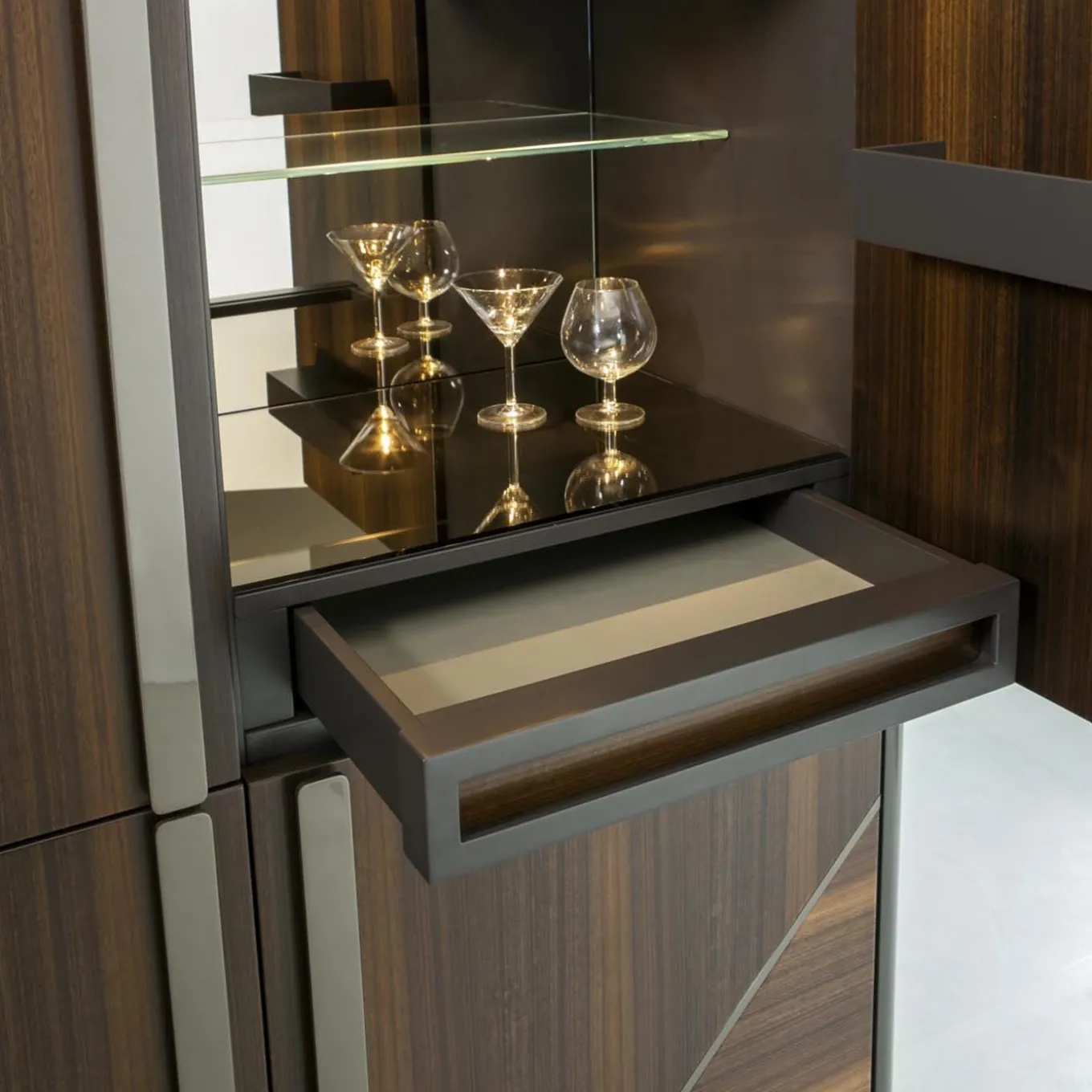 Named after its original side pieces, the Ring Bar Cabinet combines a variety of design elements and decades into a single stand-out Piece. With glass shelves, back mirrors and lights making it easy to organize and access the bar collection, the cabinet comes with soft-close hinges to prevent slamming. A complementary credenza is also available.