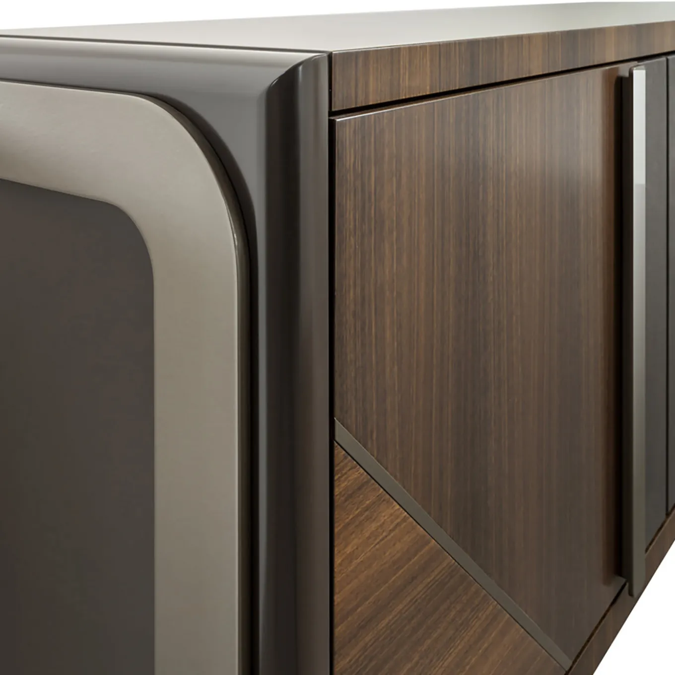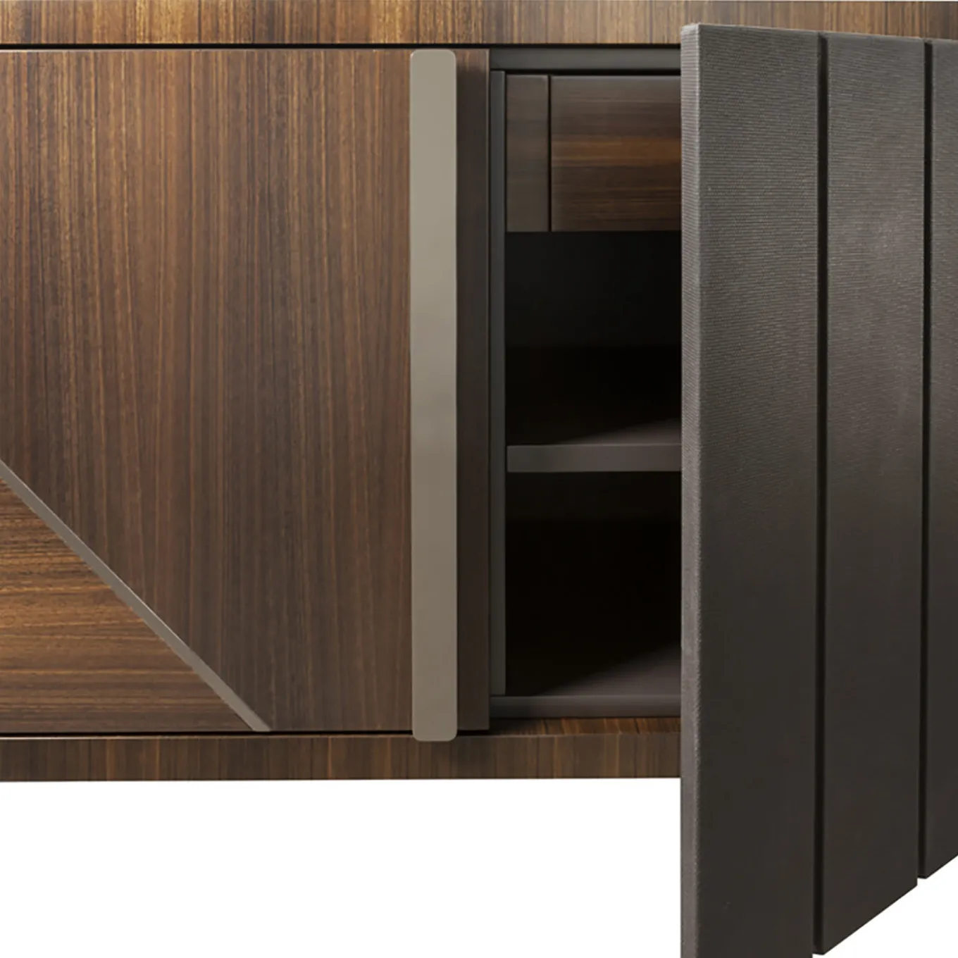 Part of a small collection of complementary styles, the Ring Credenza is named after its side supports. Accented with lacquers, leathers and glistening metal parts, the credenza stands out for its dramatic wood tones. The credenza conceals shelves and two central drawers, making it easy to organize and store dishes away.