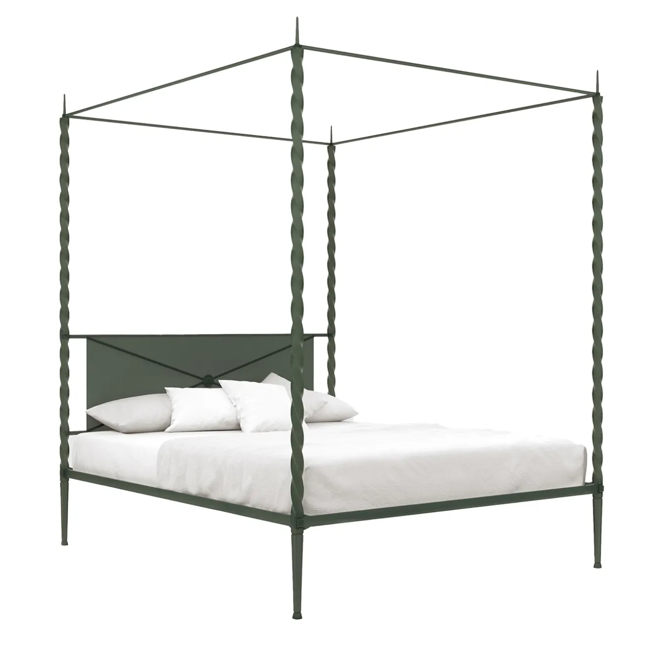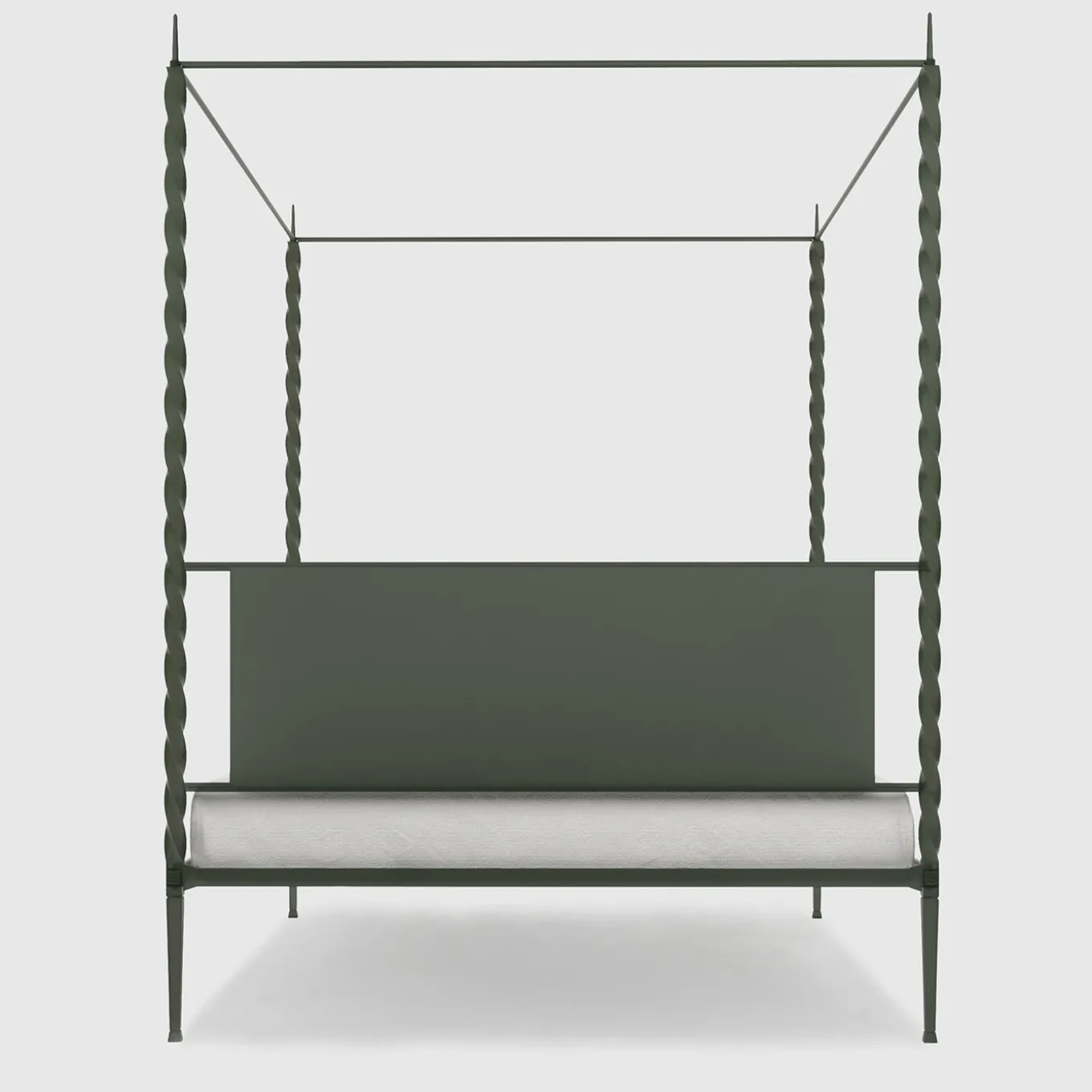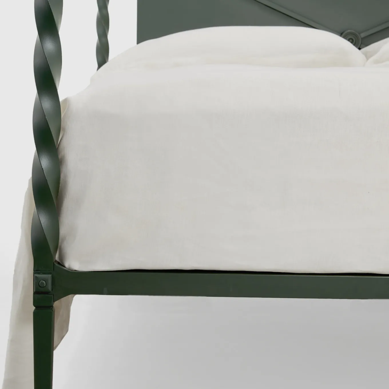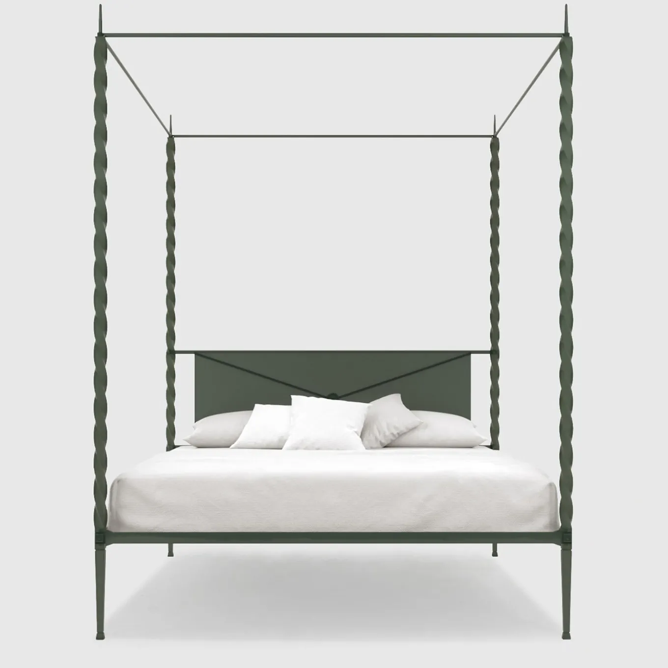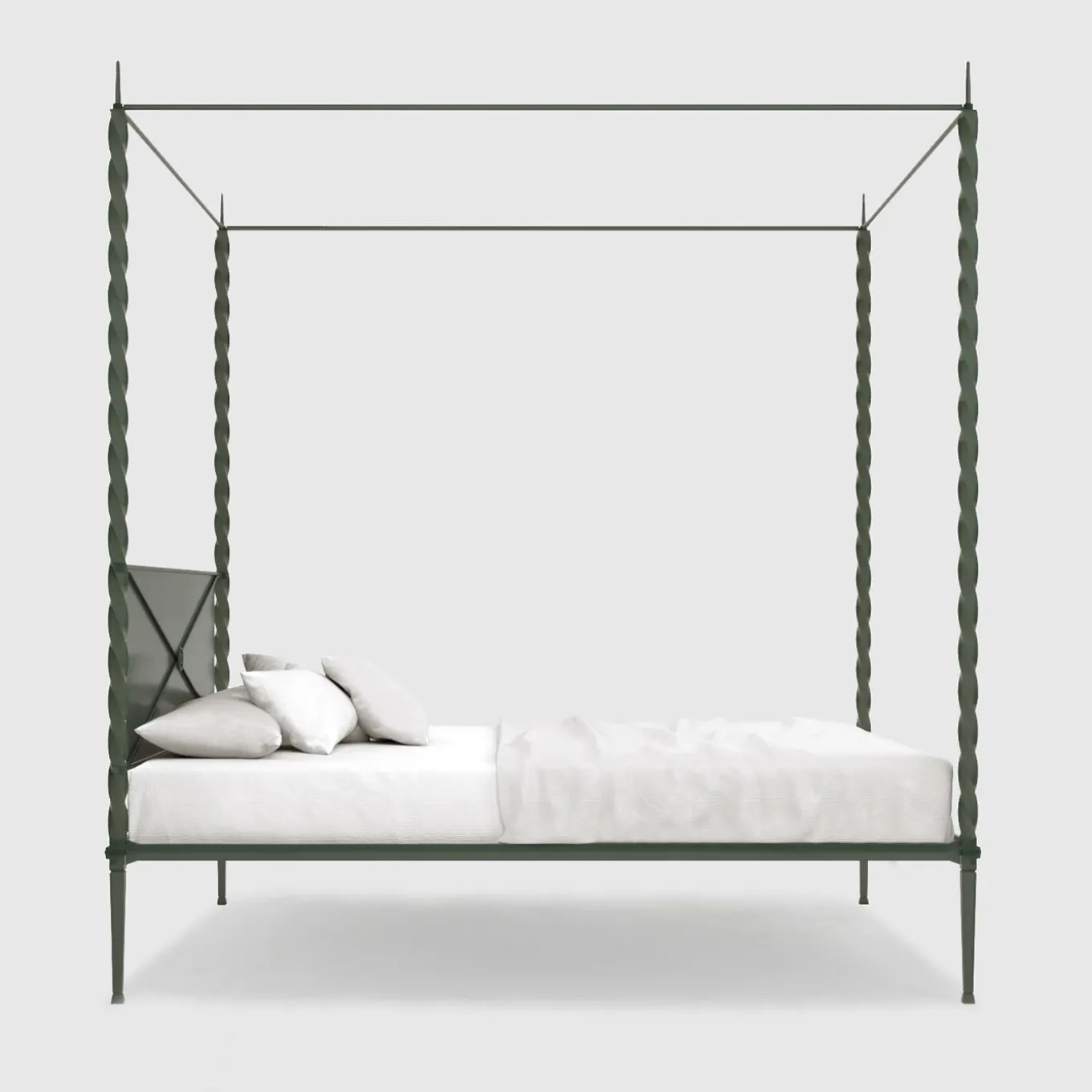 The timelessness and reliability of a solid drawn iron structure meets the intriguing charm of spiral vertical profiles in this striking hand-forged canopy double bed. Hidden clutches allow for its easy disassembly, while intimacy is favored by the soundproof metal sheet that, together with crossing tubular elements, compose the headboard. Artful reinvention of the classic four-poster bed, it also comes in a romantic pink variant.