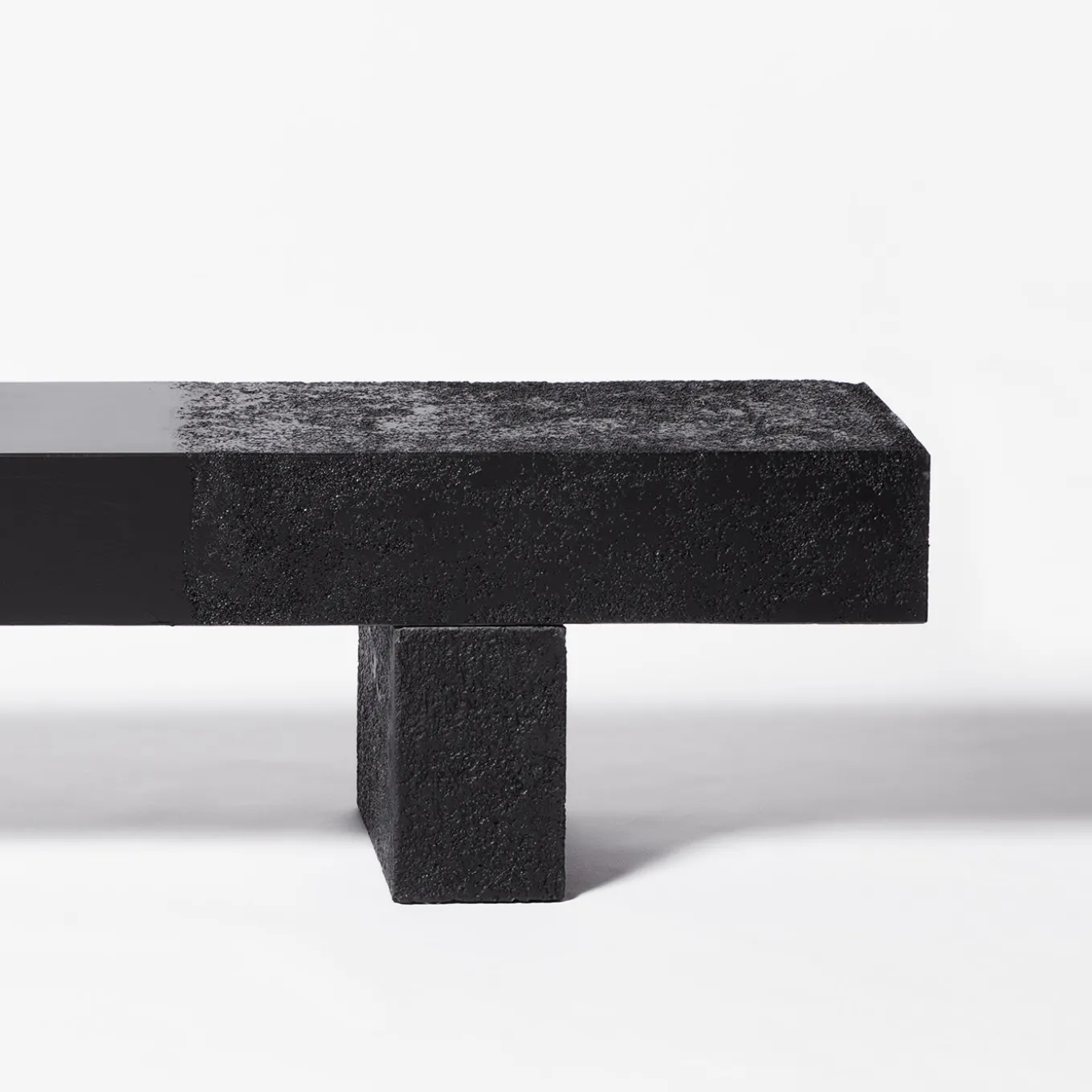Textured and sturdy, Rive is a massive bench that expresses the aesthetic of megalithic architecture through the assembly of three essential structural components. The seat, with its irregular edges, rests on a concrete cuboid leg and a brass cylinder, the veins of which are obtained through an acid-etching treatment. The surface of the concrete, on the other hand, alternates between perfectly smooth and corroded portions, created using a manual technique involving the use of sea salt.