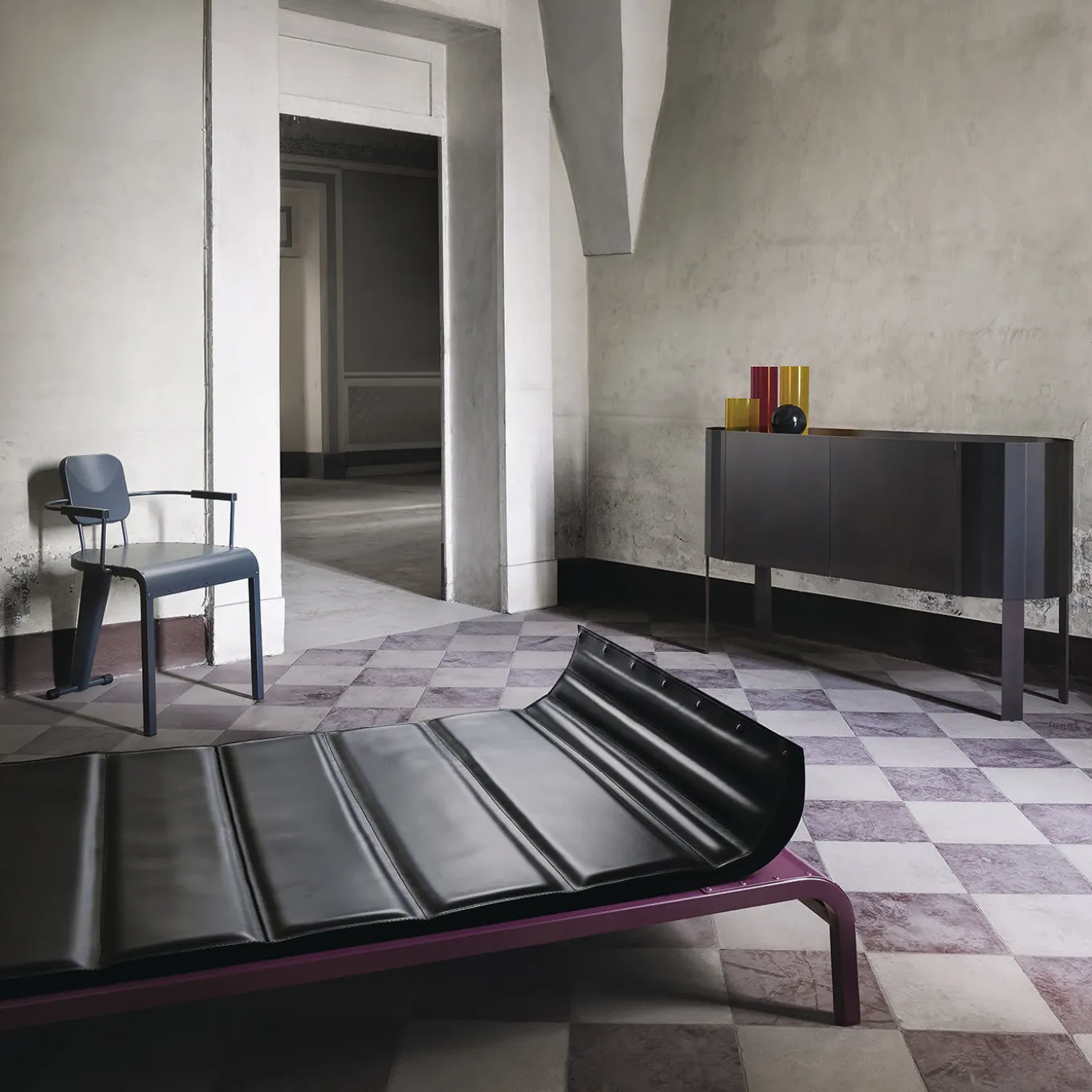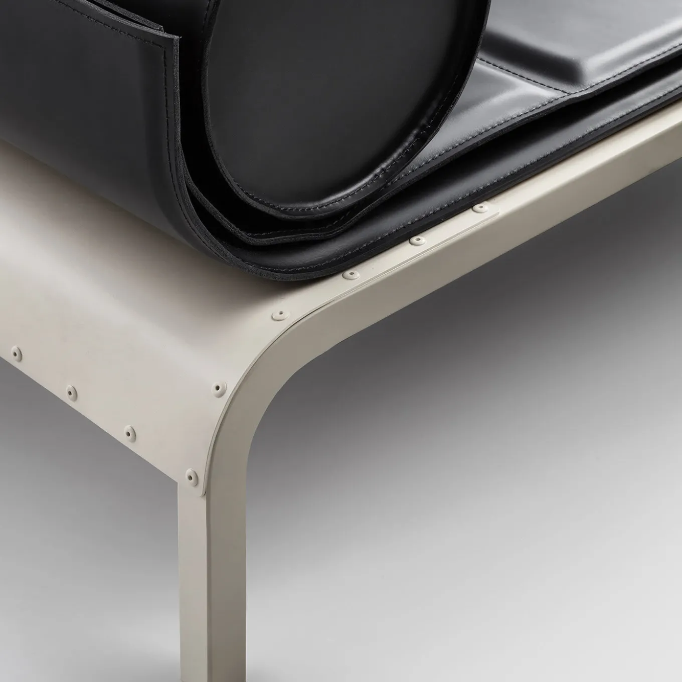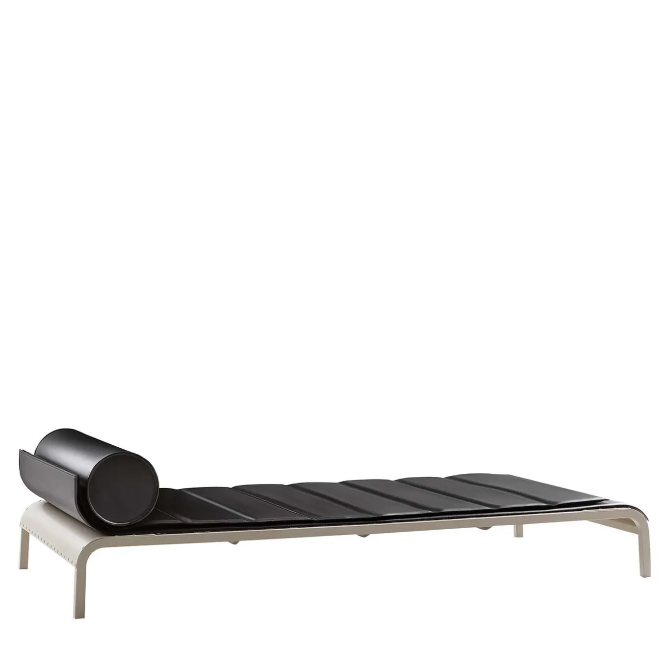 An elegant and contemporary combination of black-and-white, this splendid piece of functional decor is an indoor daybed entirely made of tubular, bent steel. Equipped with technical belts for greater comfort, the bed is furnished with a double mat upholstered of fine black leather and adorned with a cylindrical-shaped padded cushion. This piece is customizable, please ask the Concierge for details.