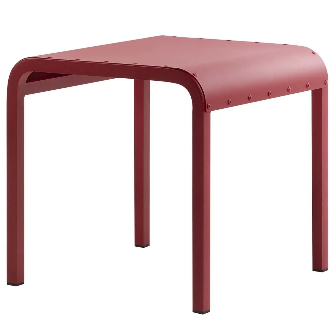Elegant minimalism and contemporary flair describe this stunning red pouf. Both suitable for indoor and outdoor areas, it boasts the shape of a small table, with four straight and sturdy legs, and a smooth top marked by a series of upholstery studs in the same color. This piece is entirely crafted of aluminum and is available in other colors upon request.