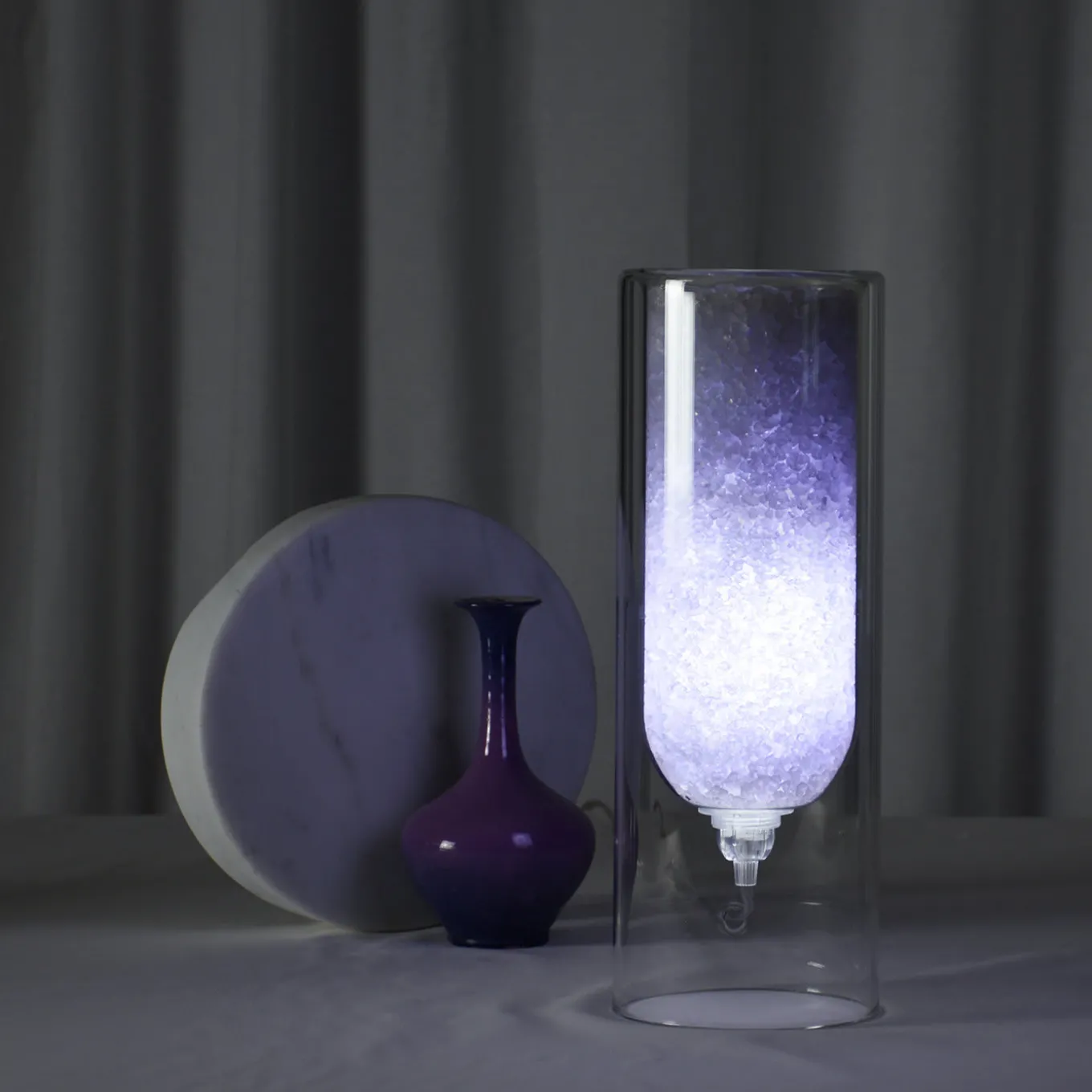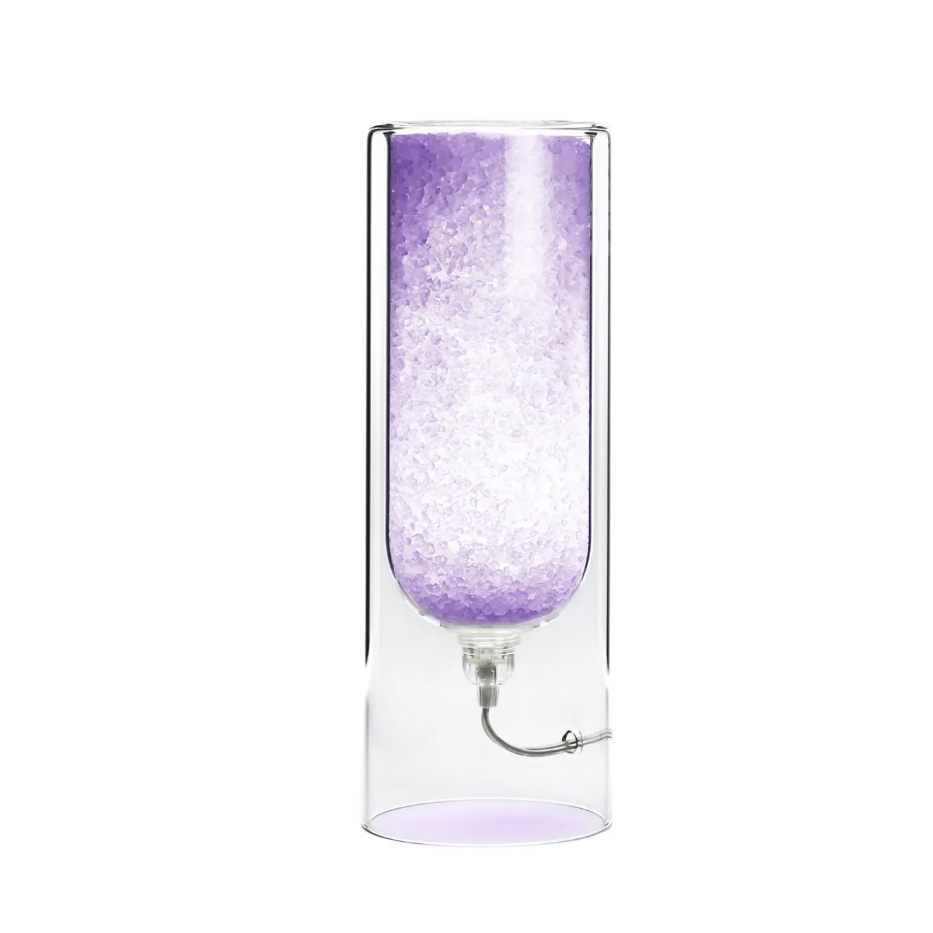 This extra-small version of the limited series Rocklùmi glass table lamps (where rock hints at the rock salt and “lumi” is the Italian referring to non-electrical lights) exploits pure rock salt crystals housed in its cylindrical body to turn into a humidity regulator. The included, low-consumption LED light (4W A+++) lights up the crystals accenting their light-green hue obtained with vegetable pigments. Suitable also as a fragrance diffuser by adding essential oils’ drops onto the top, this design features a fully-recyclable frame held together by an interlocking system.