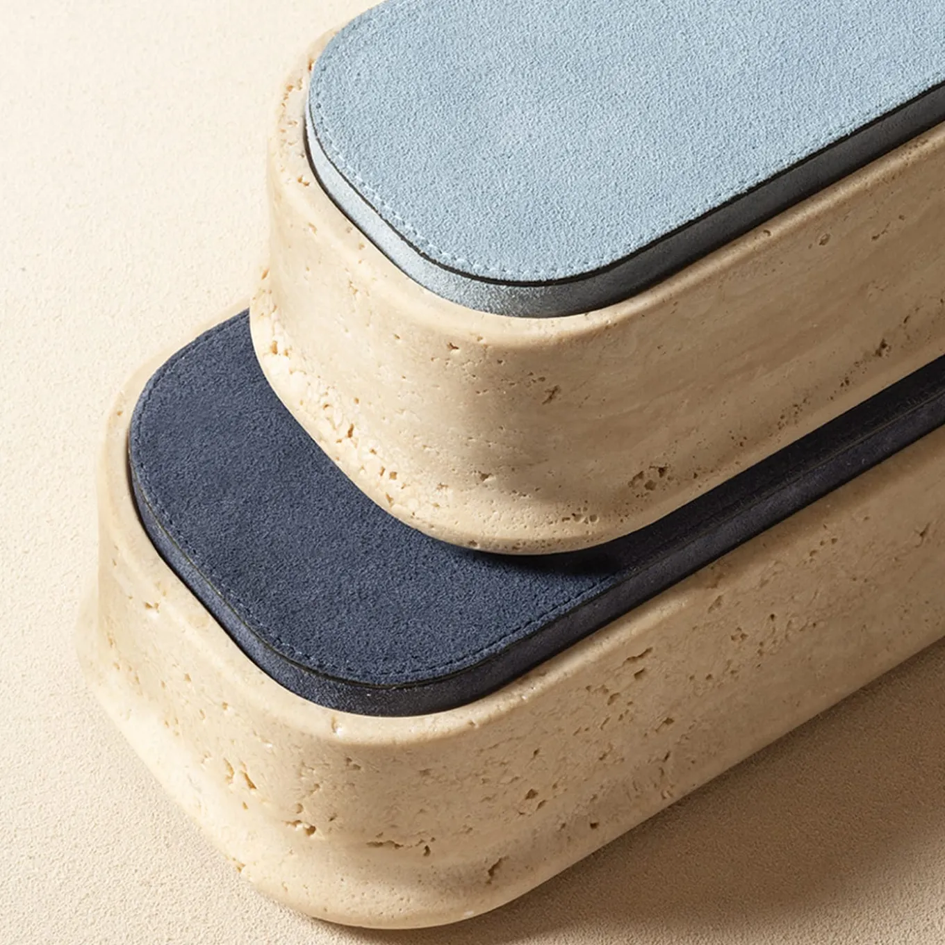 The essential lines and soft volumes of this collection fully enhances the beauty of travertine. Available in several nuances of choice, and provided with removable leather placemats, the Rodi boxes play with solids and voids, light contrasts, and color matches. Custom sizes are available on request. Travertino finishes available: Travertino Classic, Travertino Walnut, Travertino Titanium, Travertino Yellow, Travertino Red.