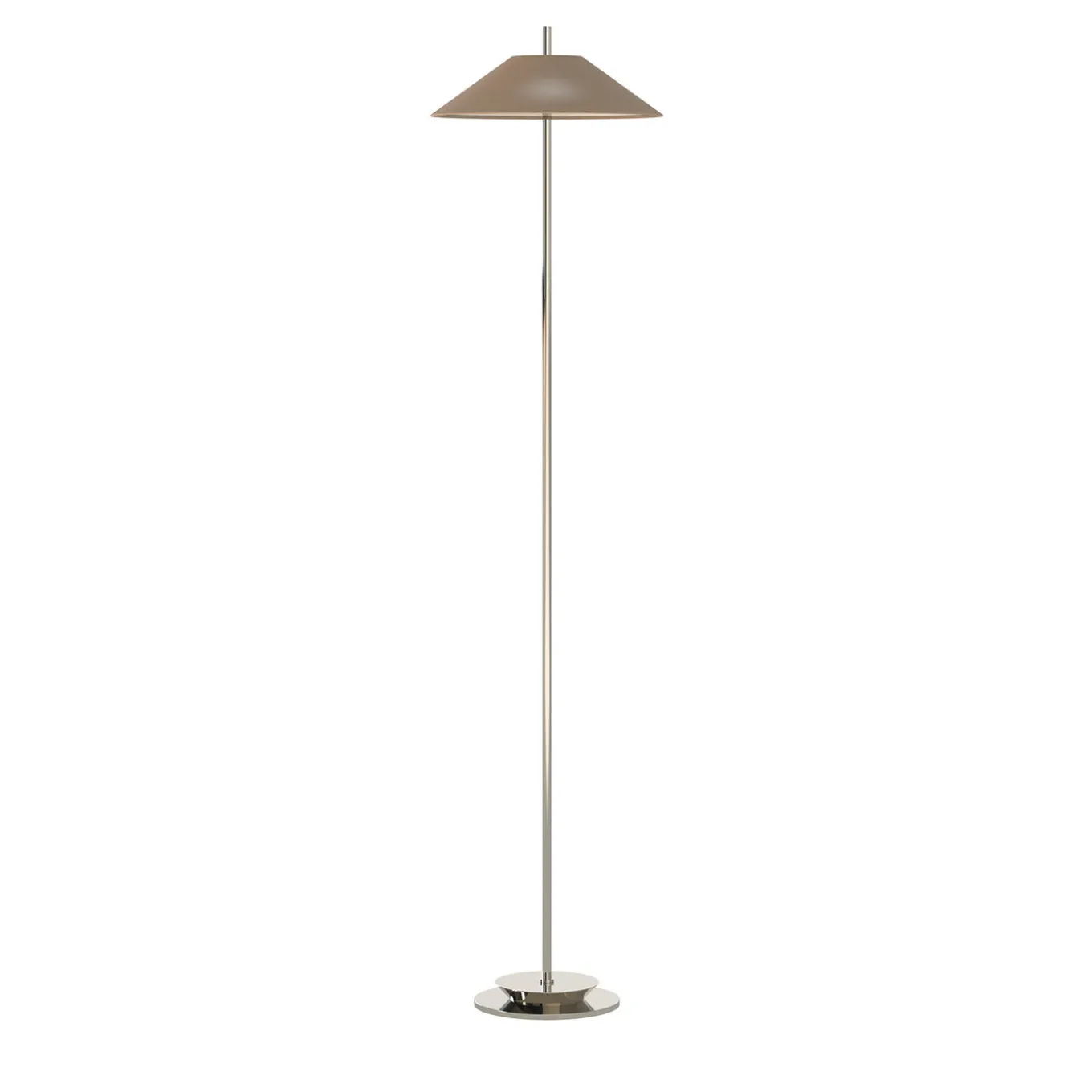 An exercise in balanced proportions and geometric volumes, this splendid floor lamp with structure in glossy nickel-finished brass will easily blend in residential indoor contexts. The tiered base, made of a cylindrical element topped by an inverted cone, sustains the elongated cylindrical structure developing upwards and passing through the conical lampshade in taupe-hued fabric.