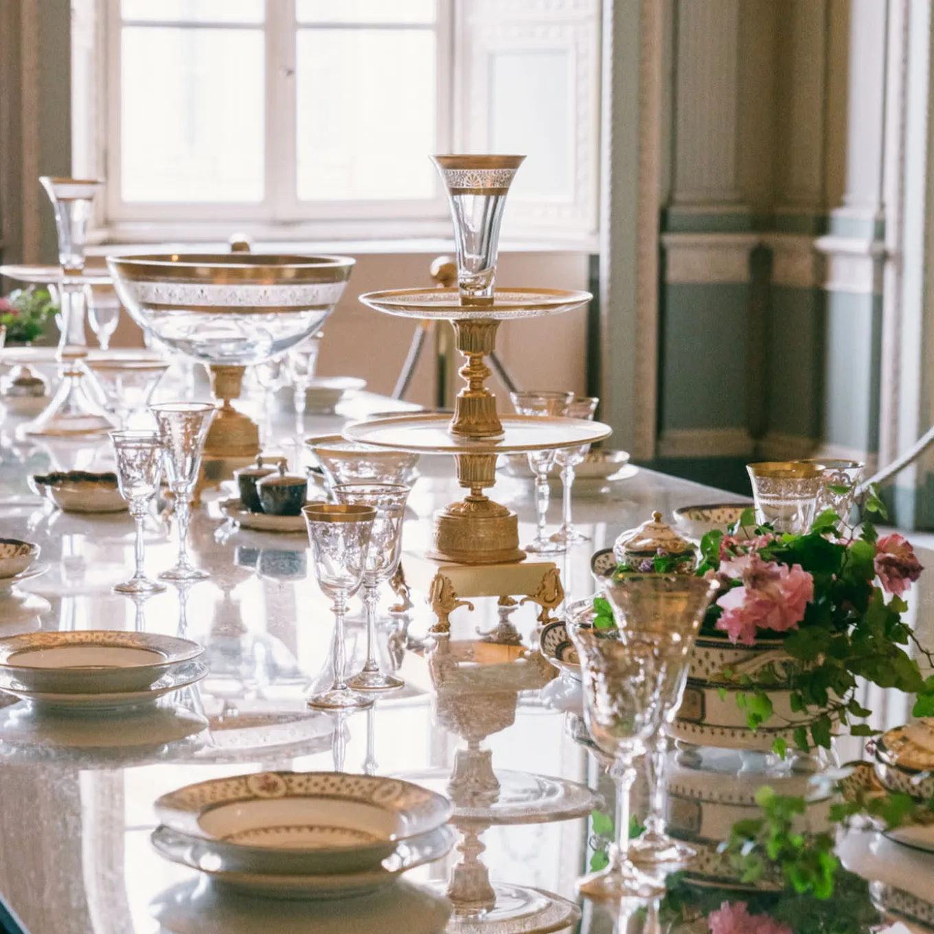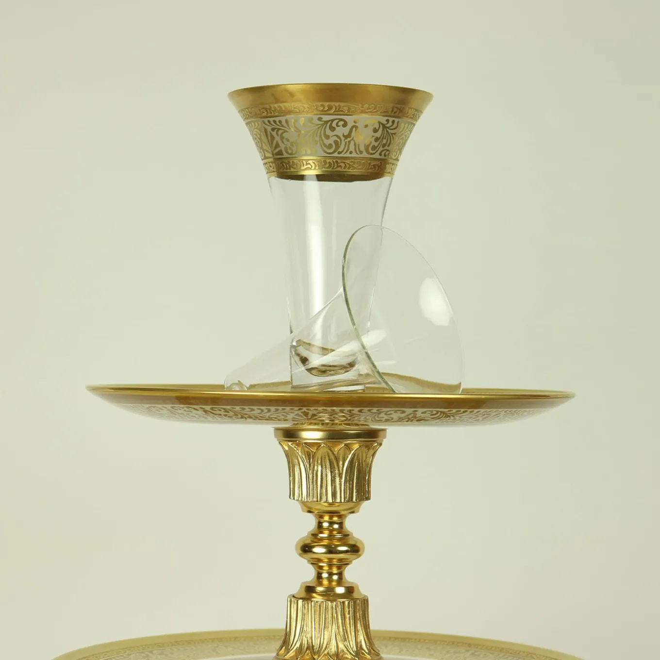 Part of the neo-classical style Rome Collection of timeless sophistication, this decorative cake stand exudes exceptional refinement and opulence. Ideally complementing a luxurious and elegant interior of both private or public and contract nature, it is handcrafted of mouth-blown glass enhanced with pure gold details, and mounted on gold-finished bronze.