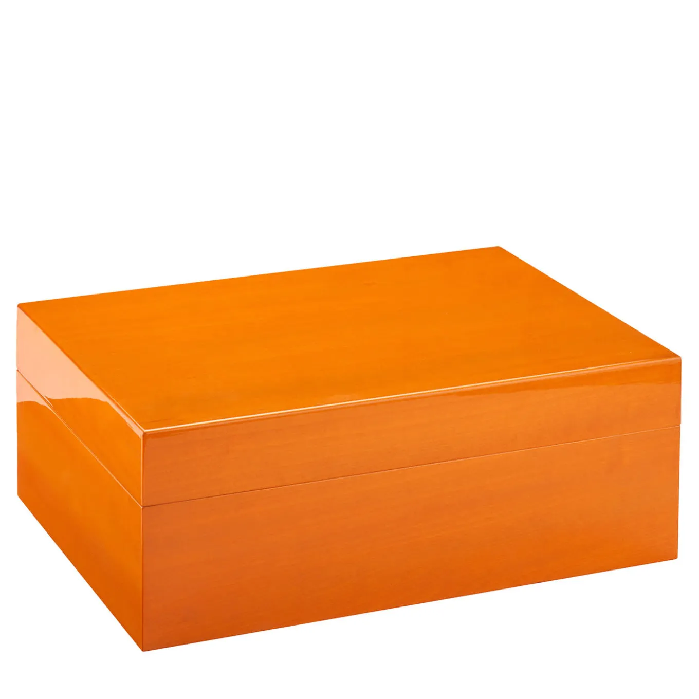 Merging traditional craftsmanship with contemporary design, this cedar wood cigar box belongs to the Roma series of exclusive handmade designs. Enriched with golden galvanized metal details, it is painted in an orange hue enhancing its natural grains, polished and brushed by hand with polyester for a luminous mirrored finish. Holding up to 40-50 cigars, it is comprised of a hygrometer and a humidifier holder. Available in other colors and sizes, please consult the Artemest catalog for options.