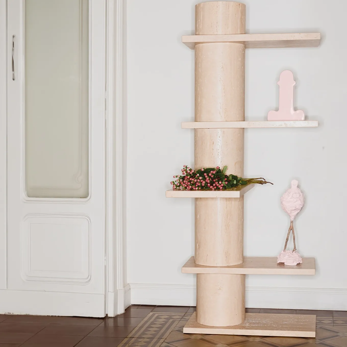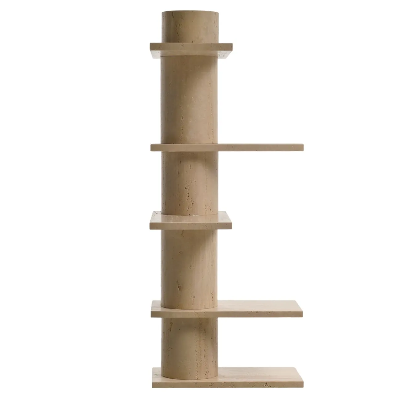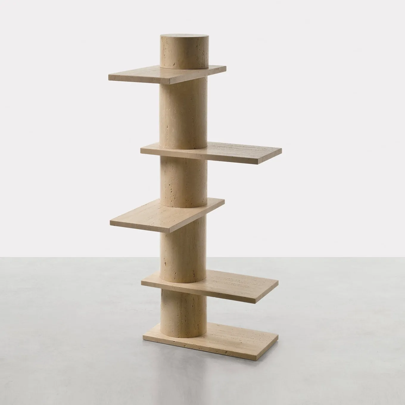 A column fitting shelves on top of each other in different directions deconstructs the classic image of a bookcase. A clear reference to a historical architecture based on repeated, minimal gestures without any rhetoric. Solid Roman Travertine structure. Direction of shelves can be moved before fixing.