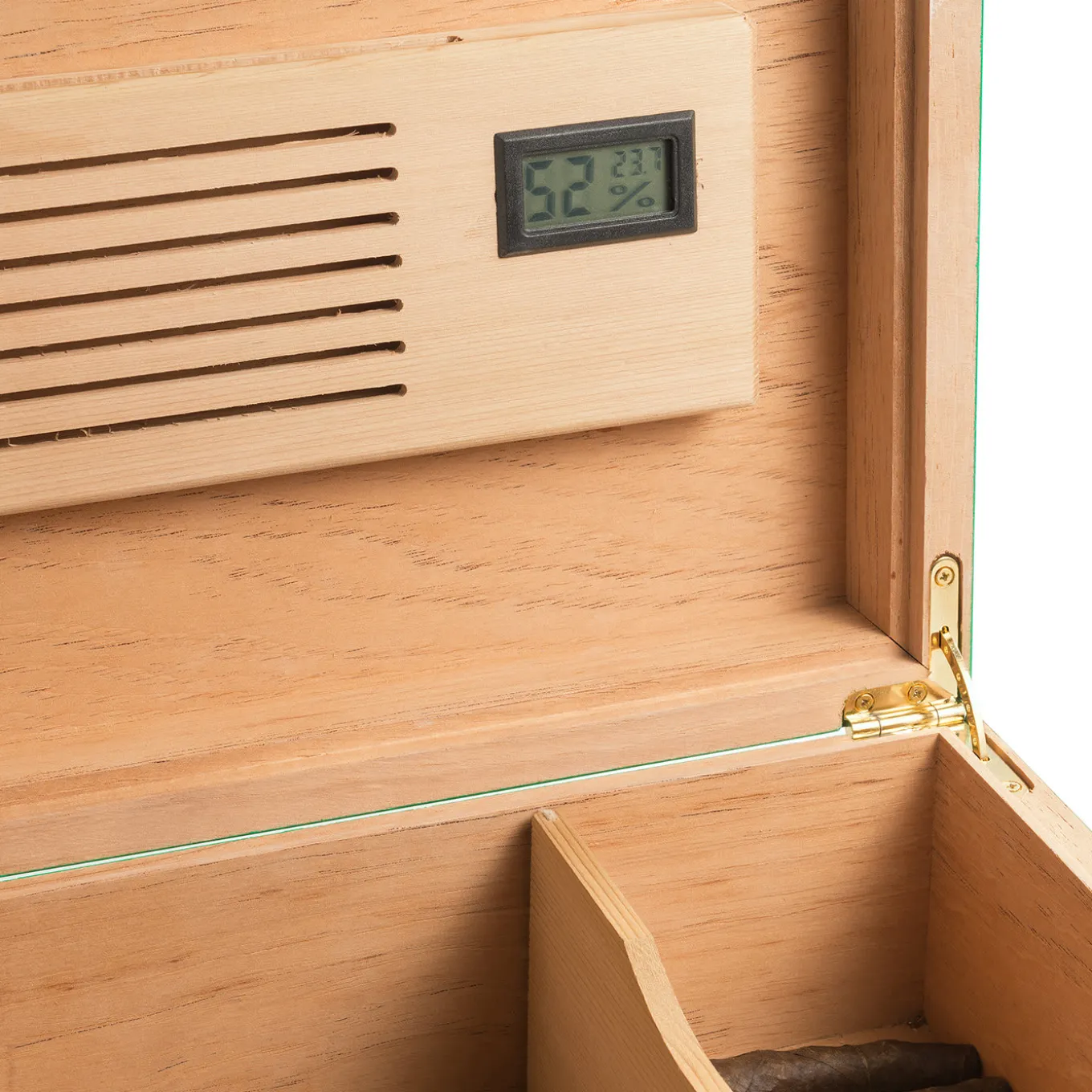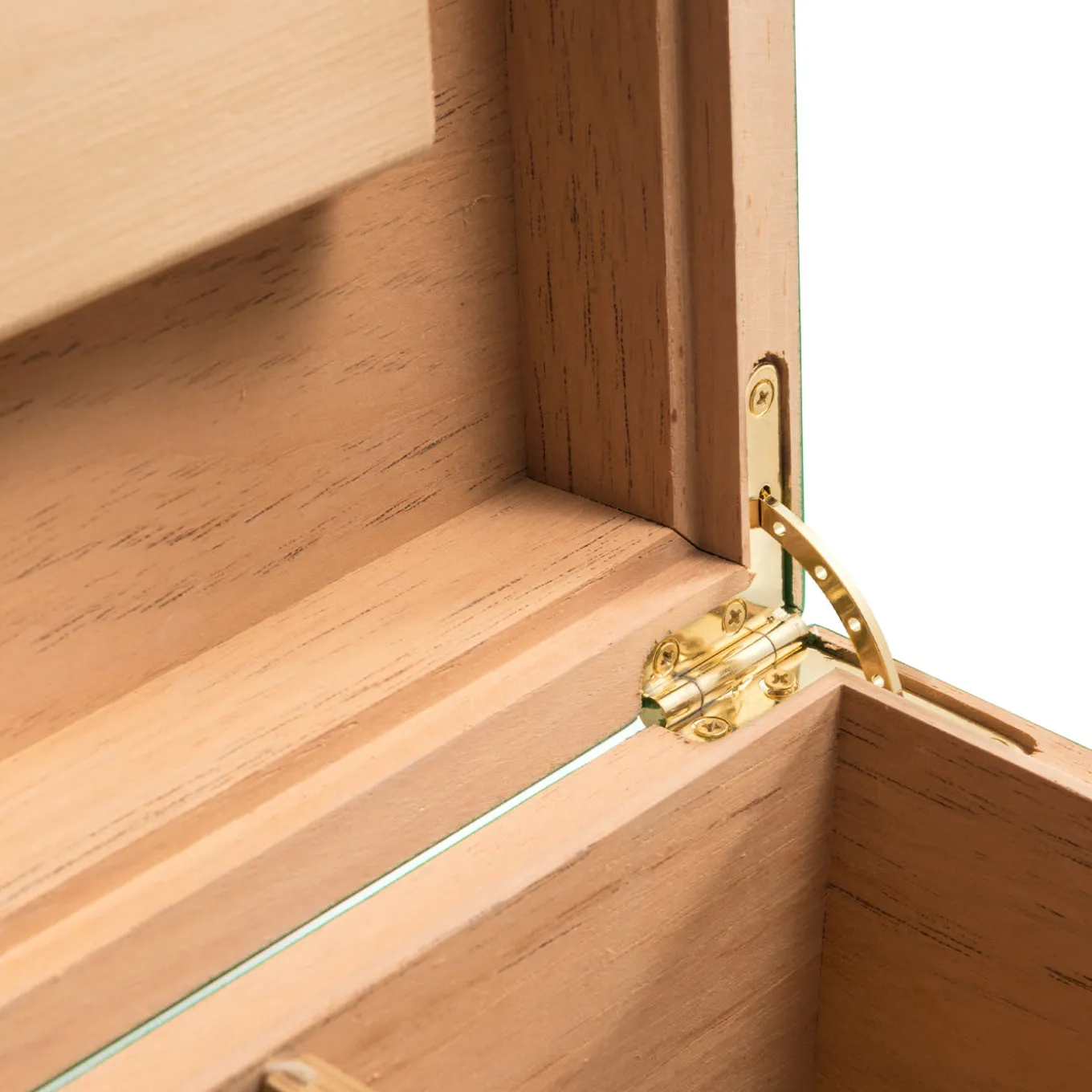 A clean and essential design of refined sophistication, this cigar box will be the perfect gift for a beloved one on any occasion. Exceptionally handcrafted and painted by hand, it is fashioned of cedar lacquered in a blue-polyester hue enriched with gold-finished metal details. This piece includes a hygrometer and Boveda holder and has a capacity of maximum 50 cigars.
