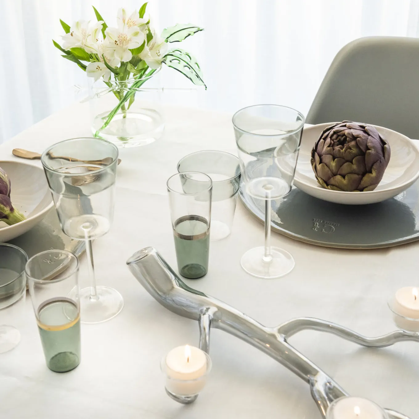 This remarkable set of mouth blown glasses from the Roma Collection is distinctive for a delicate color combination that will enliven any table setting on both formal and casual occasions. Including one water tumbler and a stemmed wine glass, the set features a clear base with a ribbed surface and a light gray band around the rim. The water glass measures 9.5 H. x 8.5 ⌀ cm, the stemmed wine glass measures 19.5 H. x 8 ⌀ cm.