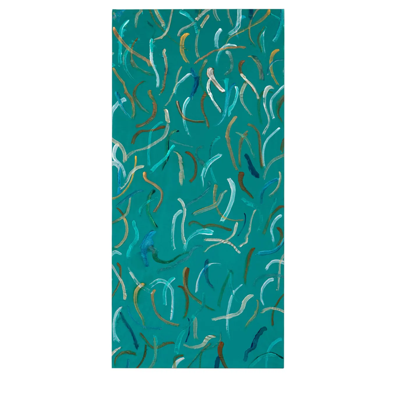 Effortlessly standing out in modern and contemporary settings, this gorgeous tapestry is painted by hand on organza silk with mixed metallic and iridescent acrylic colors. Mounted on a wooden frame, the luminous, earthy hues of this unique artwork will infuse sophistication into any room in a modern home.