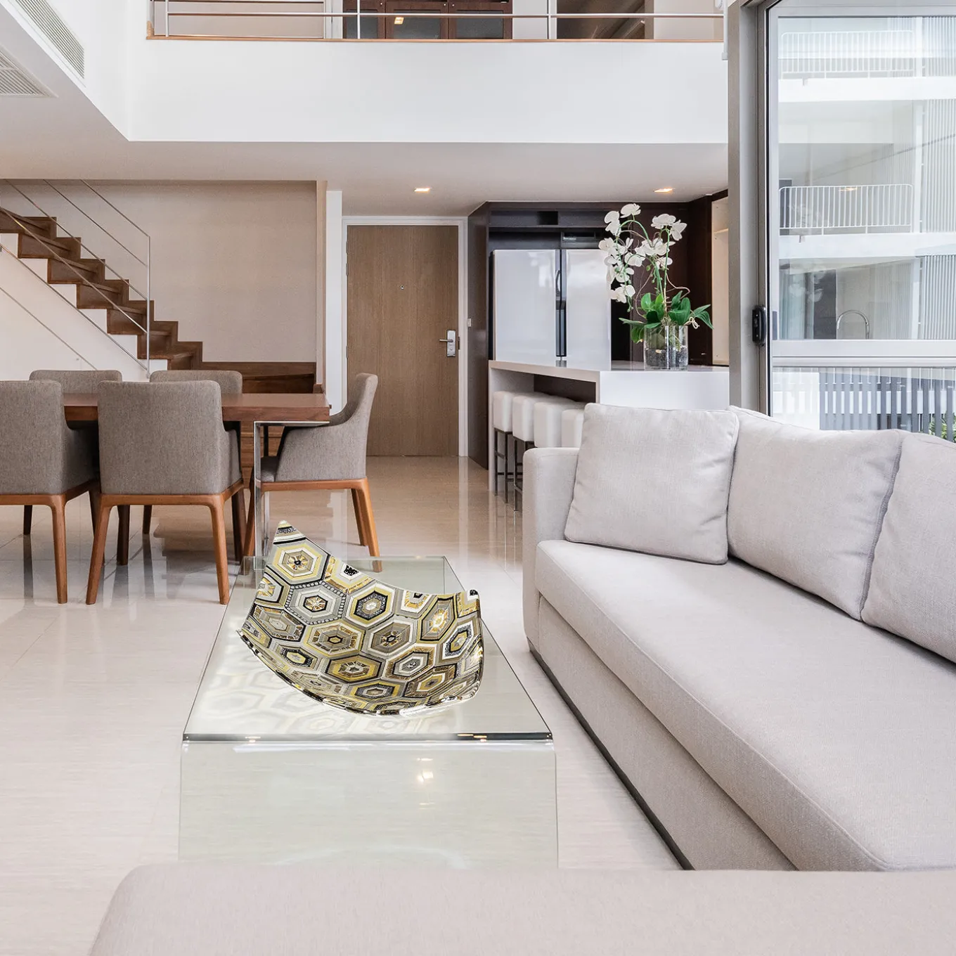 Elegantly crafted centerpiece featuring an original hexagonal shape with decorative maiolica patterns fused with smoky gray glass tones, enhanced by gold leaf and venetian murrine accents. Its geometric and chromatic design evokes the image of kites soaring in the wind. The complex creation process involves careful color sequencing and precise shaping, resulting in a distinct piece for lovers of traditional, classic style. Dimensions may slightly vary due to artisanal production.
