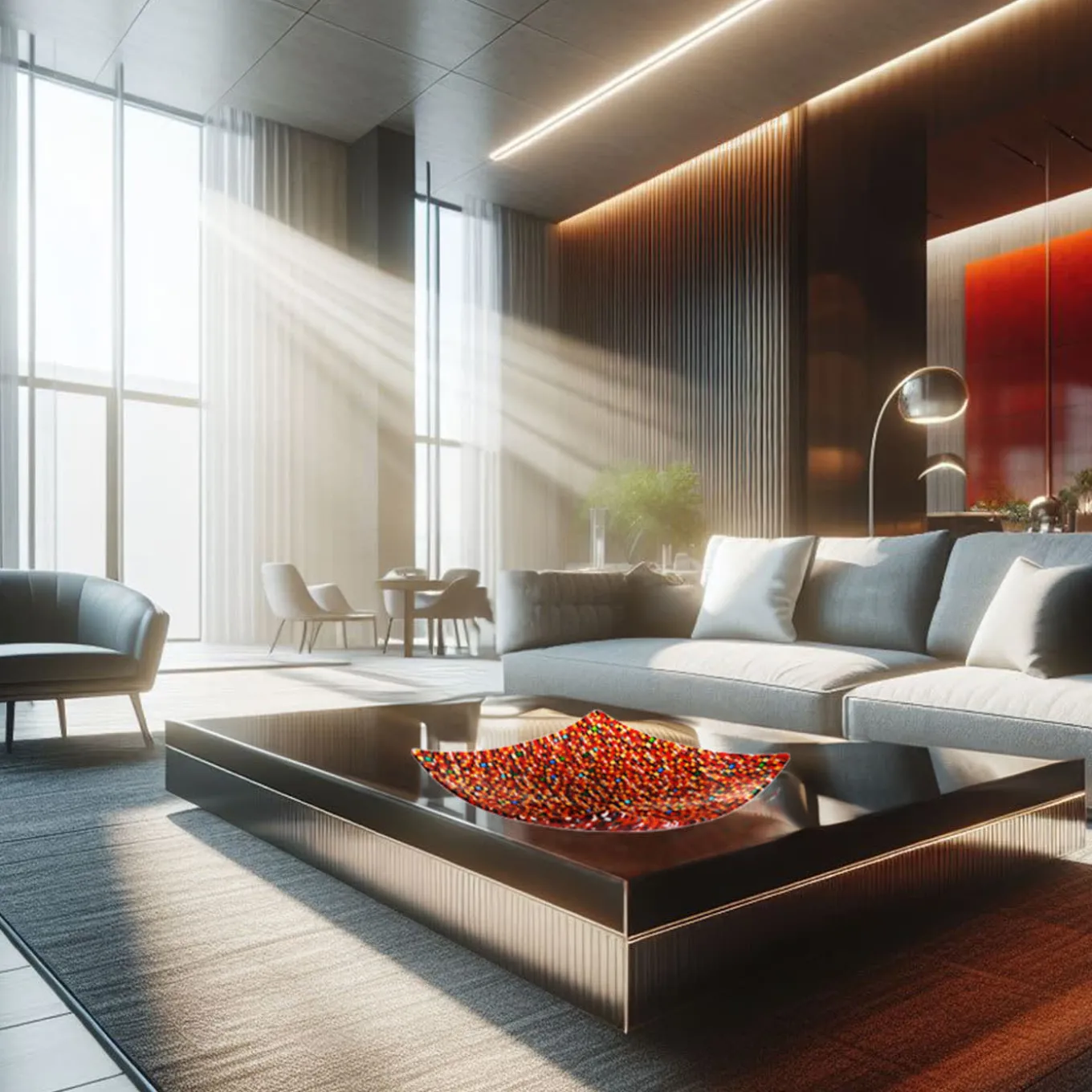 This stunning glass centerpiece is a showstopper with its beauty and originality. The geometric diamond shape is crafted with hundreds of small multicolored tiles, creating a mosaic with vibrant hues. The red dominant color is complemented by carefully chosen hues to create a harmonious and luminous effect. Each tile is meticulously crafted using traditional Murano glassmaking techniques passed down for centuries by Venetian artisans. Size and colors are customizable upon request.