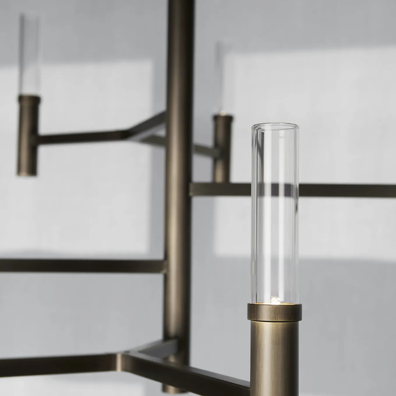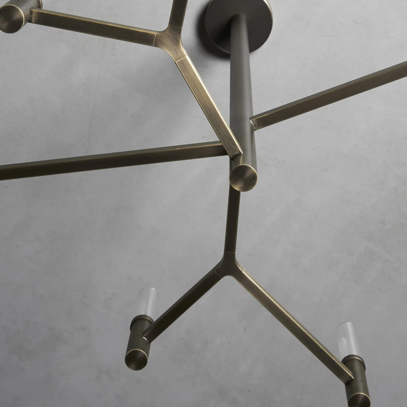 This unique chandelier of the stylish Roots Collection is a fine example of Italian craftsmanship that reinterprets the classic candle chandelier with modern flair. The dark burnished brass metal frame showcases Y-shaped arms distributed over four ascending levels supporting white cylindrical diffusers of white blown Murano glass. Suspended in a living room over an area rug or over a round dining room table, this remarkable piece holds 10 dimmable LED (G9 max 5W 350lm 2700°K) and is also offered with a light burnished brass finish.