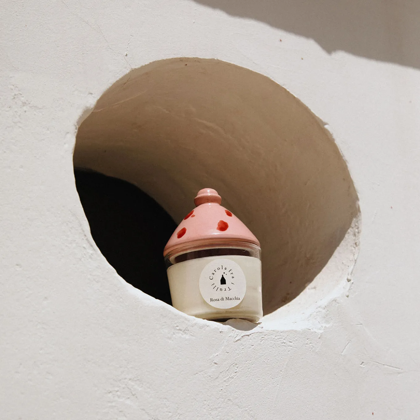 Candle in 100% soy wax and cotton wick combined with a ceramic lid handmade by qualified Italian craftsmen based on an exclusive design by the designer Carola Altamura. The color of the ceramic is matched with the fragrance of bush rose, thus creating a unique product. The candle is hand-poured by a historic Italian candle factory with respect for nature and tradition. Fragrance conceived as an ode to wild rose which, with its gentle strength climbs and thrives on dry stone walls and olive trees.