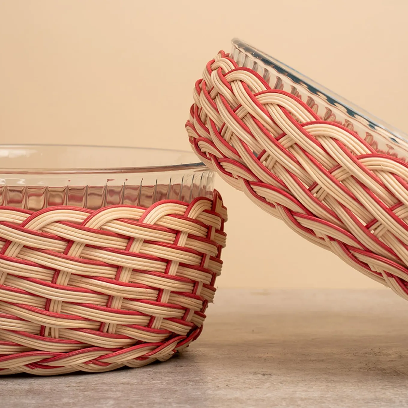 Crafted from the finest natural and rose geranium bicolor wicker, this refined cake pan comes complete with a Pyrex glass mold, ensuring elegance and functionality. The pan draws inspiration from traditional bread baskets, while the pink pigment is expertly extracted from the madder plant, renowned since ancient times for its extraordinary dyeing properties. This masterpiece epitomizes quality and refinement, making it the perfect centerpiece for celebrations or intimate gatherings.