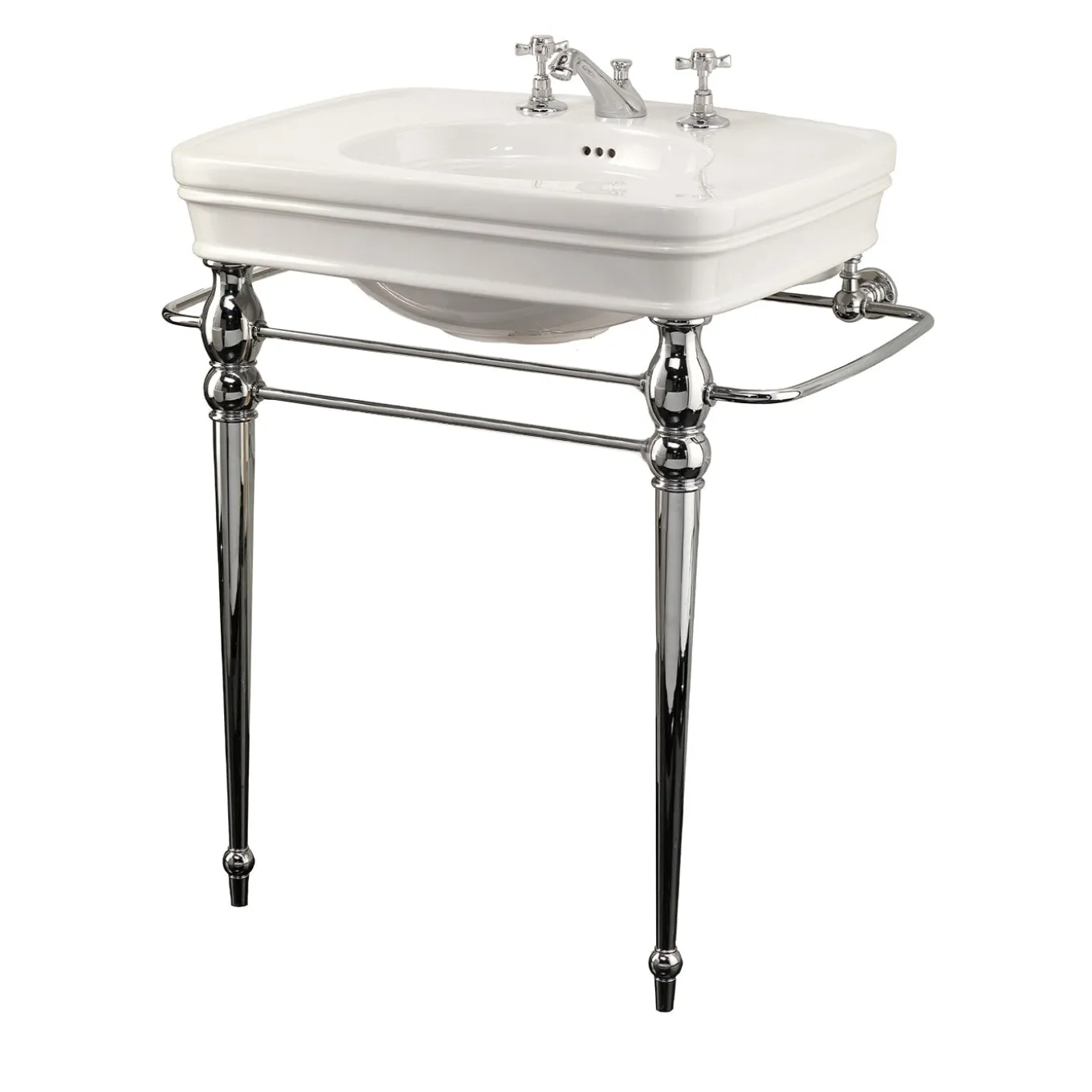 This eclectic console combines the harmonic classic inspiration with the sophisticated atmospheres of the best design from the Fifties. The aluminum bearing structure, with turned brass elements, is available in different finishes. It is completed with the porcelain basin of the same name, characterized by the large countertop surface, and with four handy towel bars. Please, contact the Concierge service for further information. Faucets are not included.