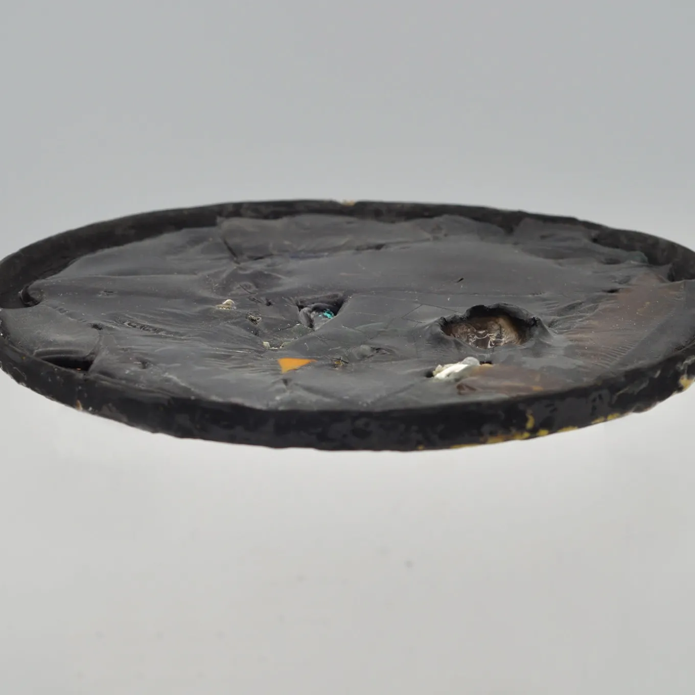 Art and design uniquely merge in this bold piece of strong visual impact: a round decorative plate superbly created by contemporary artist Maurizia Carantani. Handcrafted of single-firing terracotta, it is enriched with melted colored glass interacting with an intriguing ensemble of inserts from different materials, creating small yet expressive bursts of color on a pitch-black backdrop.