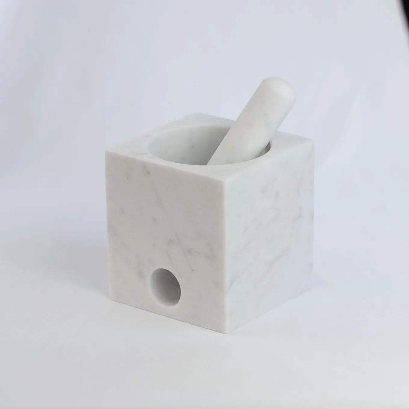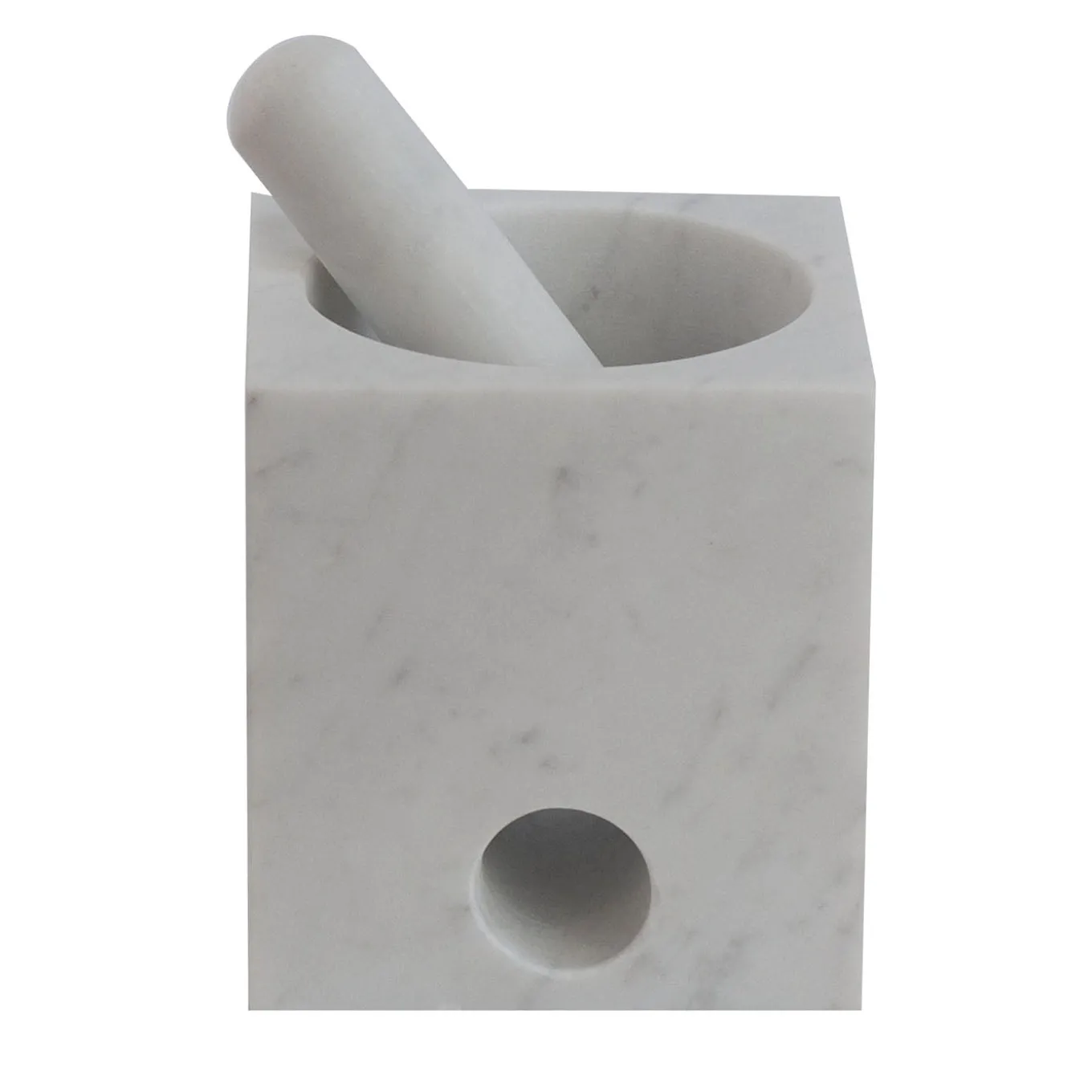A modern reinterpretation of the classic mortar and pestle featuring minimalist geometry that highlights the purity of the material. The mortar is crafted with a hollow base hole to support and lock the pestle in place, enhancing the sculptural block aesthetic. Made of satin-finished Carrara white marble, this medium-sized kitchen accessory combines functionality with refined design.