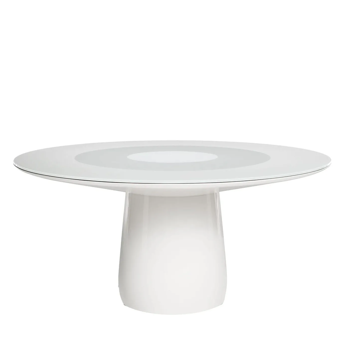 Distinguished by its layered design, Roundel by Claesson Koivisto Rune (2018) reimagines the classic round table with a multi-tiered glass surface in white. Three concentric glass disks create zones for different uses, while the lacquered polyurethane base offers sculptural elegance. Its minimalist design ensures equal visibility and access for everyone seated, making it perfect for social or professional gatherings. Available in other color combinations for a bold statement.