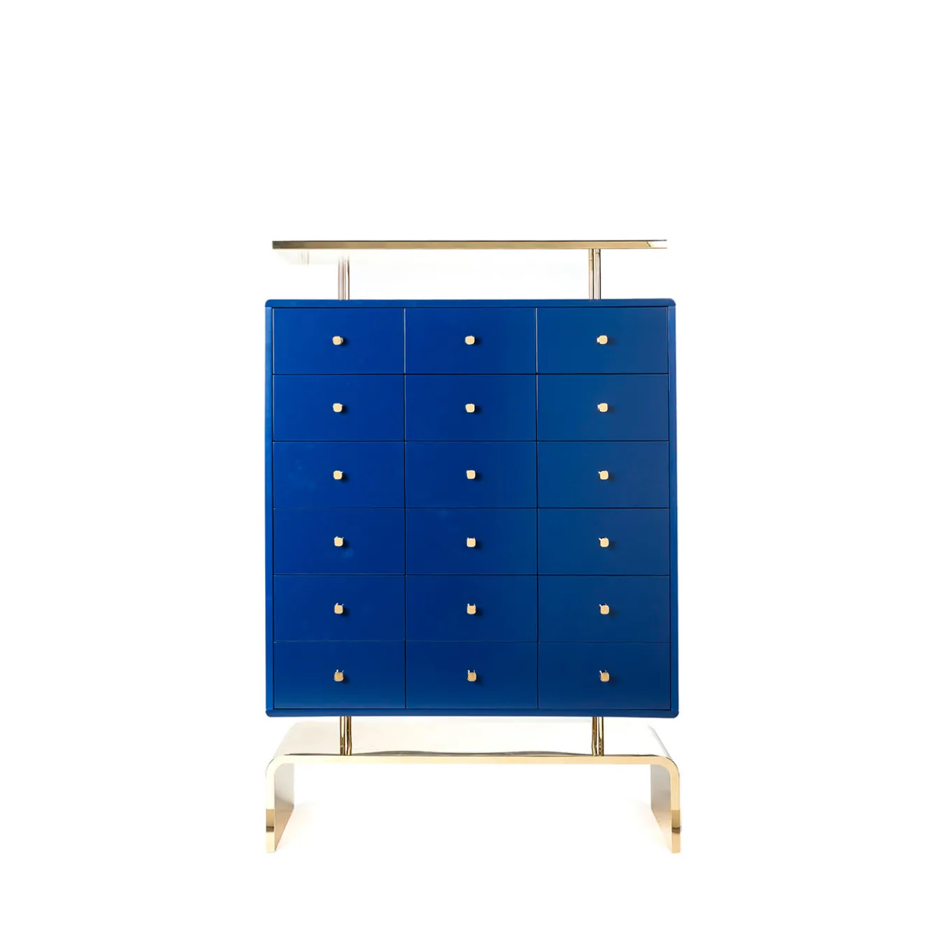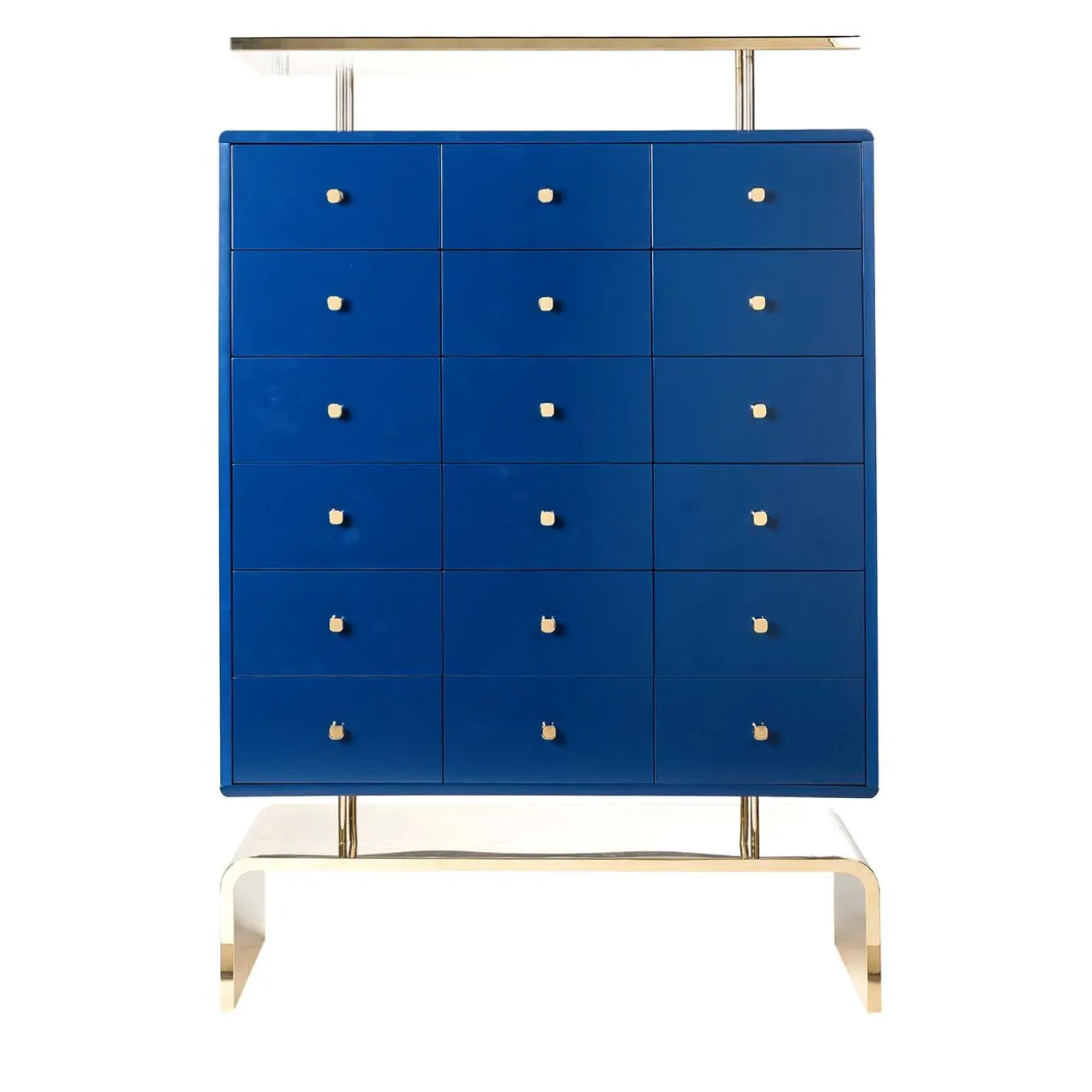 Paired with the Auspicious Dresser in the same evocative collection by Lea Chen, this cabinet will create a unique display, while also providing storage space in any room in the house. Its structure is reminiscent of the Chinese pharmacy cabinet, called Yaochu, or “the hundred-eyed cabinet”. Refined and modern, this piece will look stunning in a modern home. The steel structure features a lavish coating for base, top, and handles in 24k gold, while the body of the piece and three drawers are lacquered matte blue outside and red inside.