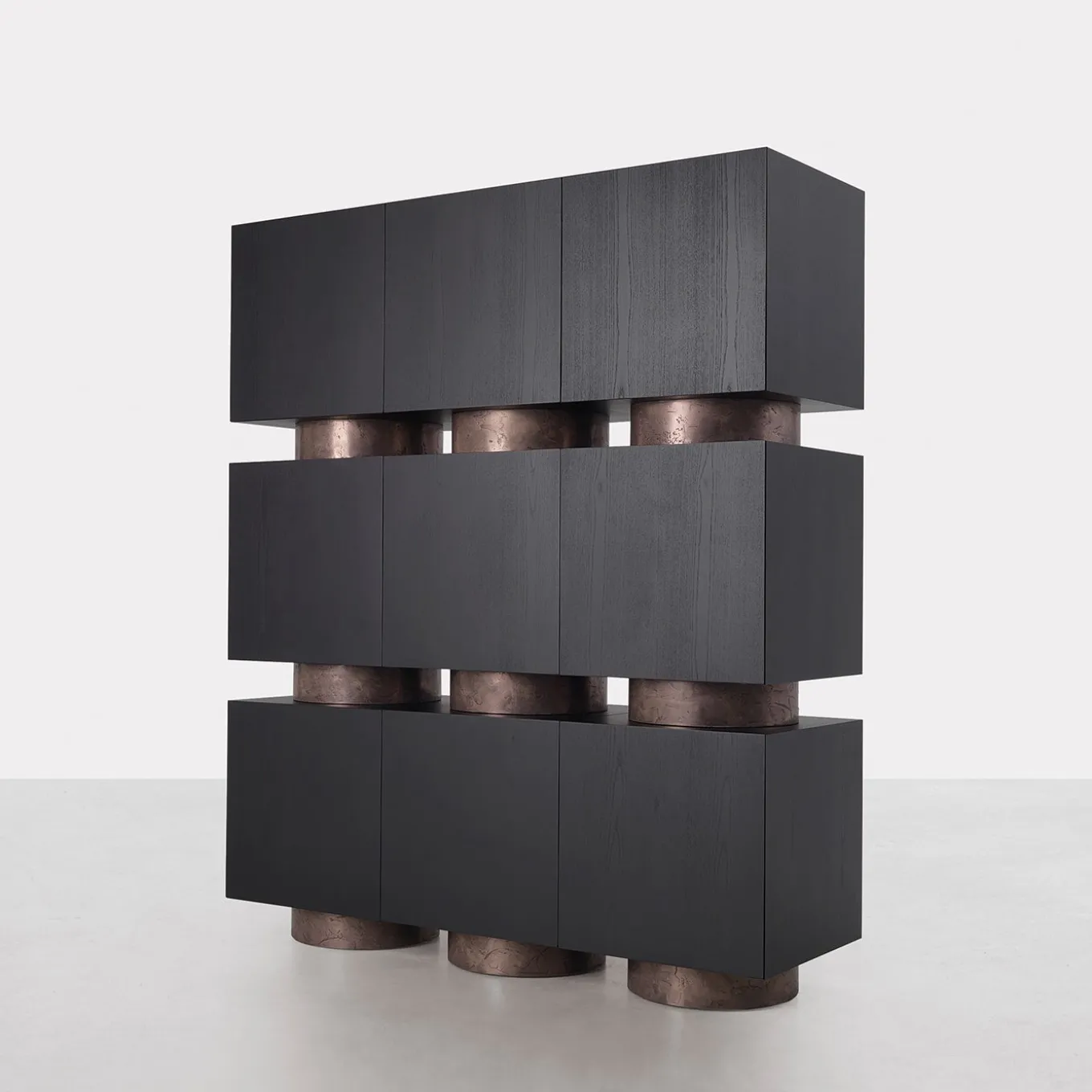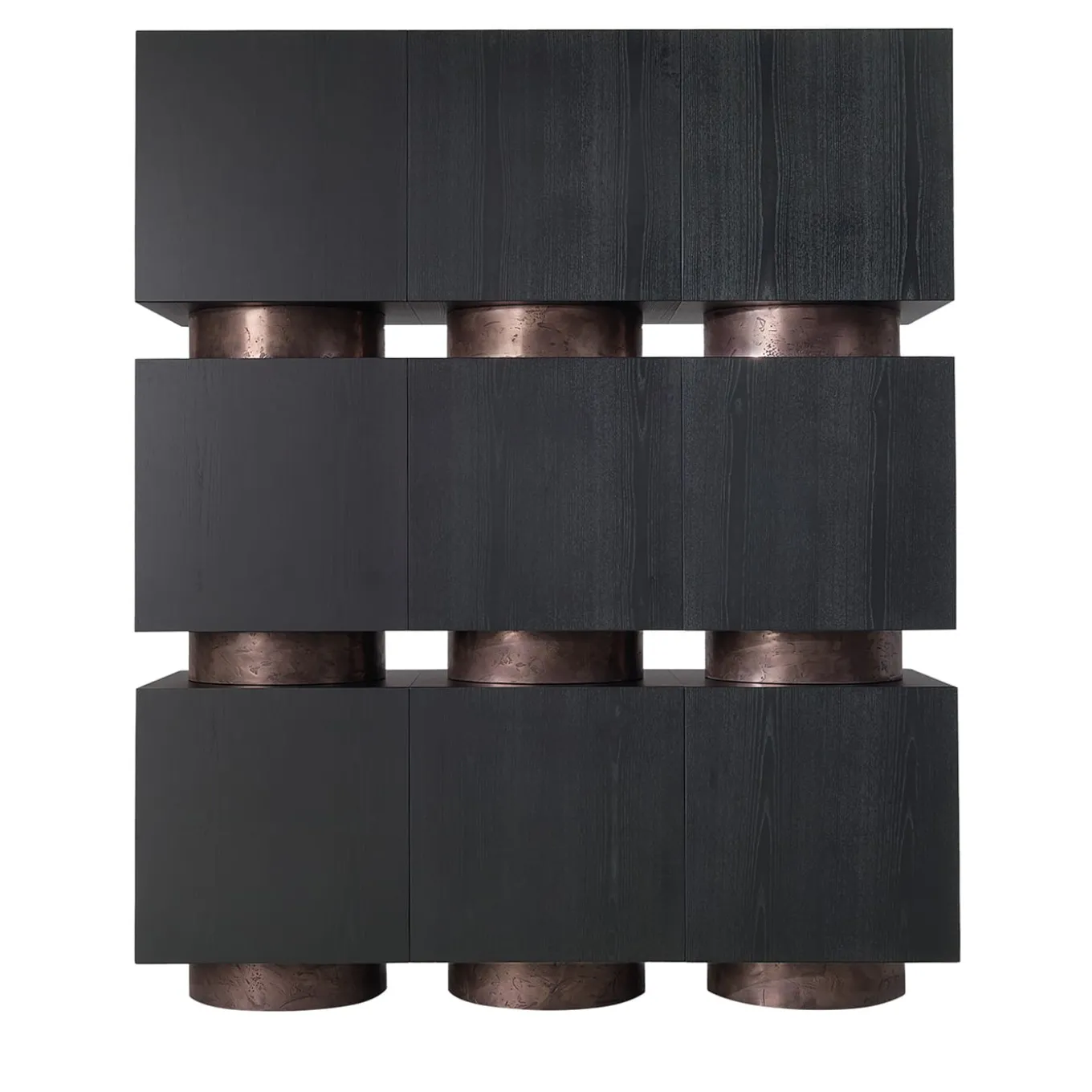 Inspired by the most famous of cubes, these volumes can be stacked endlessly. Its rigid and essential appearance is inversely proportional to its compositional flexibility. Doors with push-pull system opening. Internal compartment with bronze glass shelf. The element is modular as a sideboard or bookcase. Ash wooden veneer in black open pore matt finish, mdf base with Pure metal finish in Burnished Copper-Bronze mix. More finishes are available, please contact the concierge for more information.