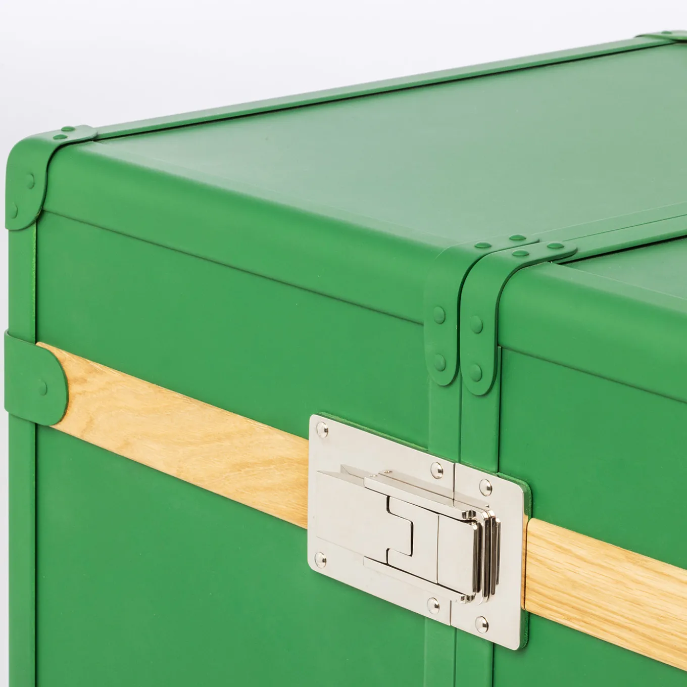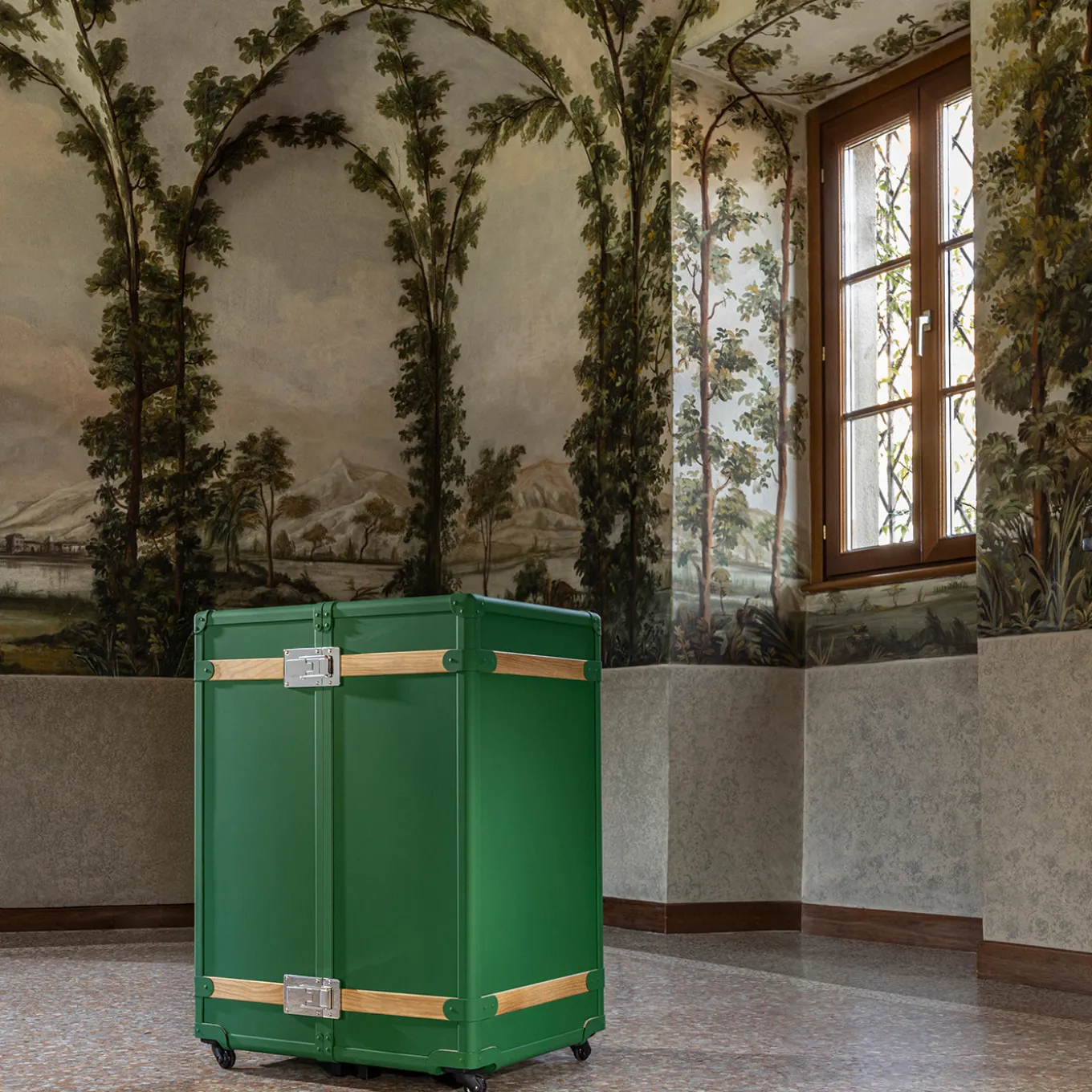 Saint-Tropez wardrobe trunk features a lacquered exterior with a unique rubberized finish accented by oak inserts and chrome-plated brass details. Designed to organize a variety of belongings, it offers an interior with compartments, oak drawers, and leather handles. Its medium size and wheeled base enhance portability, making it a practical yet stylish storage solution for travel or home use.