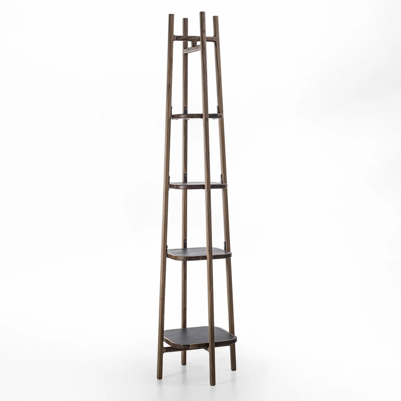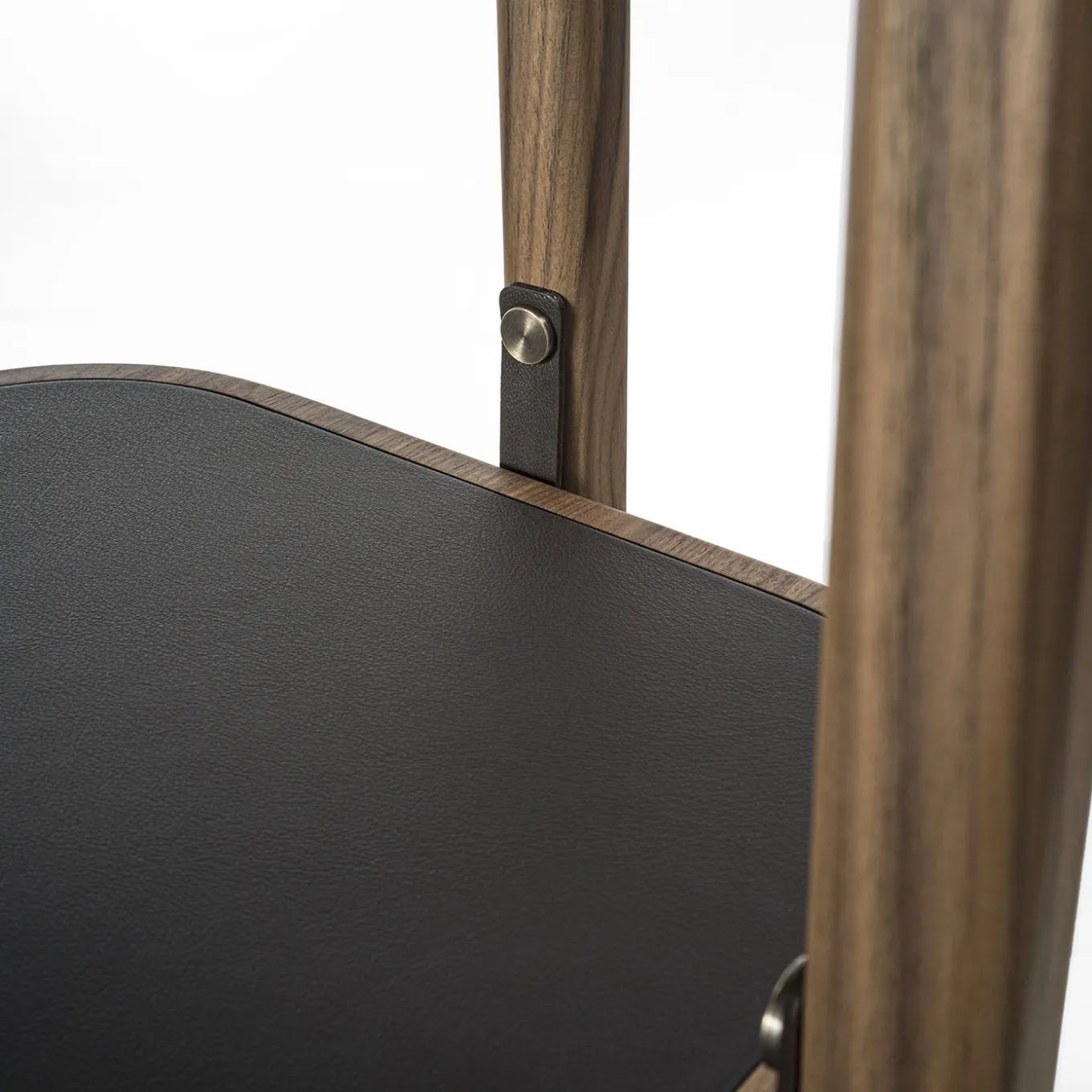 The Salina five-level bookcase in walnut wood features a refined structure with vertical and horizontal rods creating a sinuous silhouette. Each shelf is framed in wood with a leather top and supported by distinctive leather brackets studded with bronze, adding an elegant detail. This open shelving unit blends functionality with exquisite craftsmanship, perfect for organizing books and decorative objects with style.