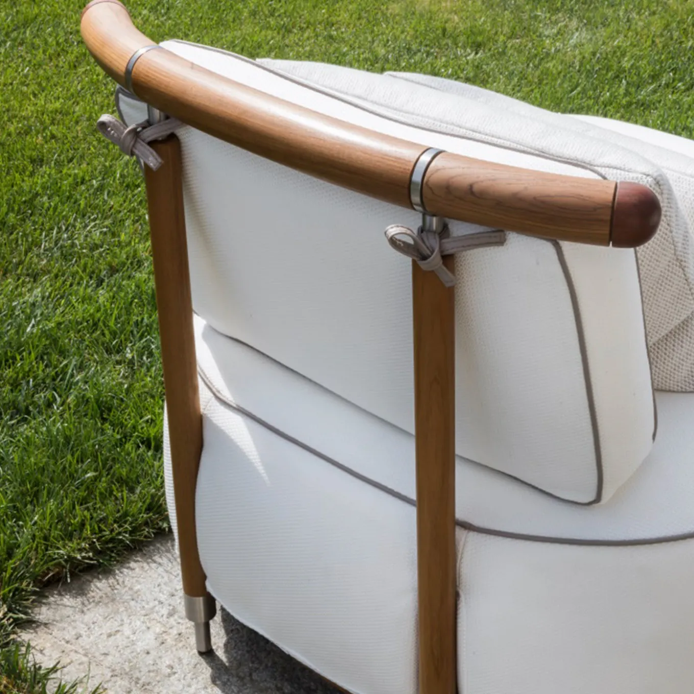 The perfect accent piece to enjoy late-night conversations, this armchair was designed for outdoor use. First-rate iroko wood and nautical stainless steel are used to craft the solid frame, which hosts the plush seat and backrest. Two cushions providing extra comfort for the back and lumbar area are included.