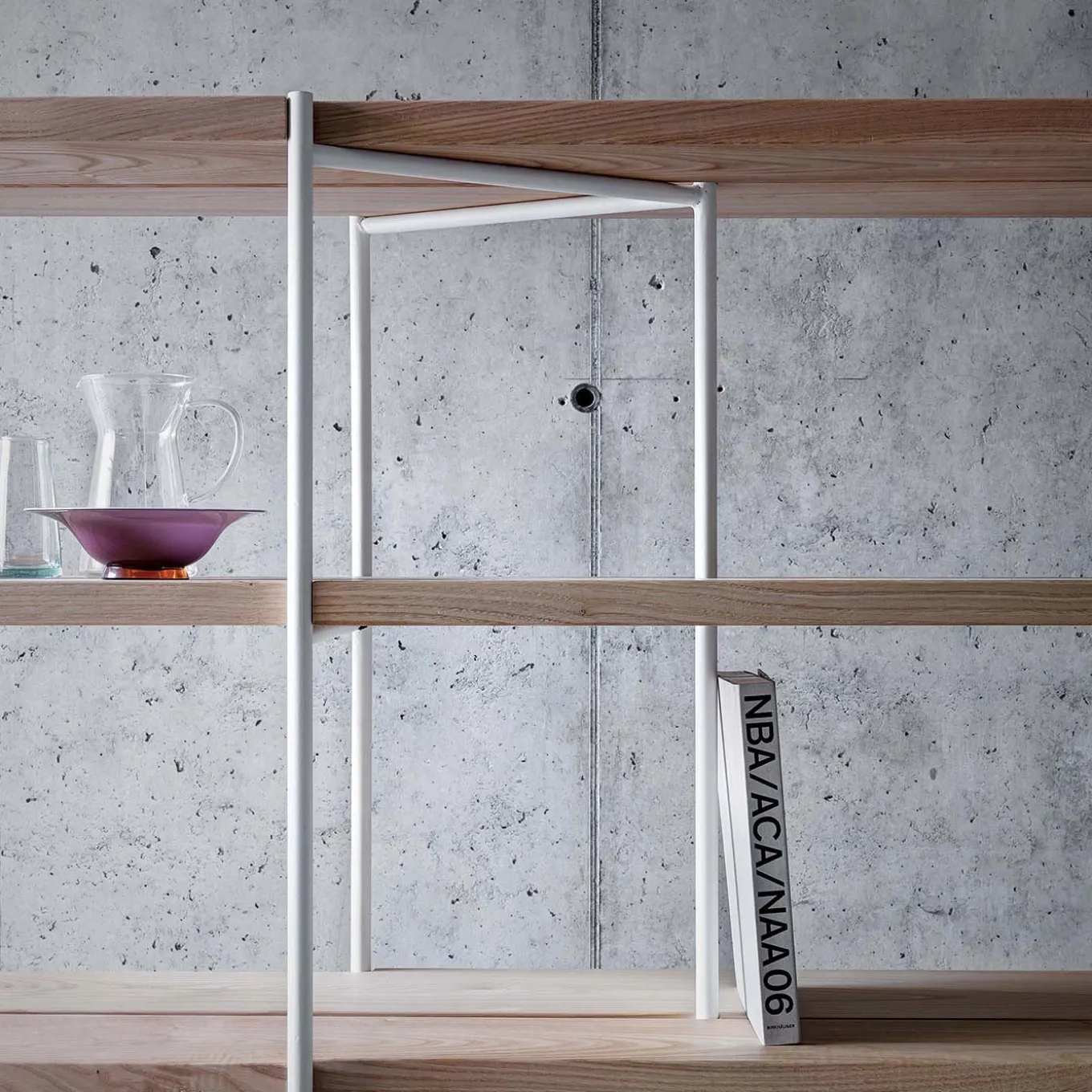 A striking and versatile complement to a modern home, this bookcase by Act_Romegialli is made of iron and wood, each marking a different tension, with six vertical white-lacquered iron supports in groups of three, and five solid wood shelves. Either in oak, chestnut, or walnut, these thick horizontal layers showcase the unique grain of the wood, seemingly floating in the air. The steel can also be finished in iron-grey or pale blue lacquer. Please inquire with the Concierge for details and pricing.