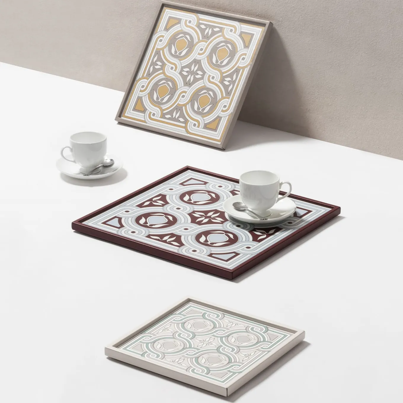 With patterns that take inspiration from characterizing details found in suggestive corners of Venice, these printed leather trays are a celebration of the iconic city on water. Featuring different sizes and shapes, the Venezia collection combines historic legacy with modernity, and is the expression of the artistic and cultural vivacity that marks the city’s history. Graphic pattern inspired by a decoration on the left side facade of the Basilica di San Marco in Venice. Only available as shown.