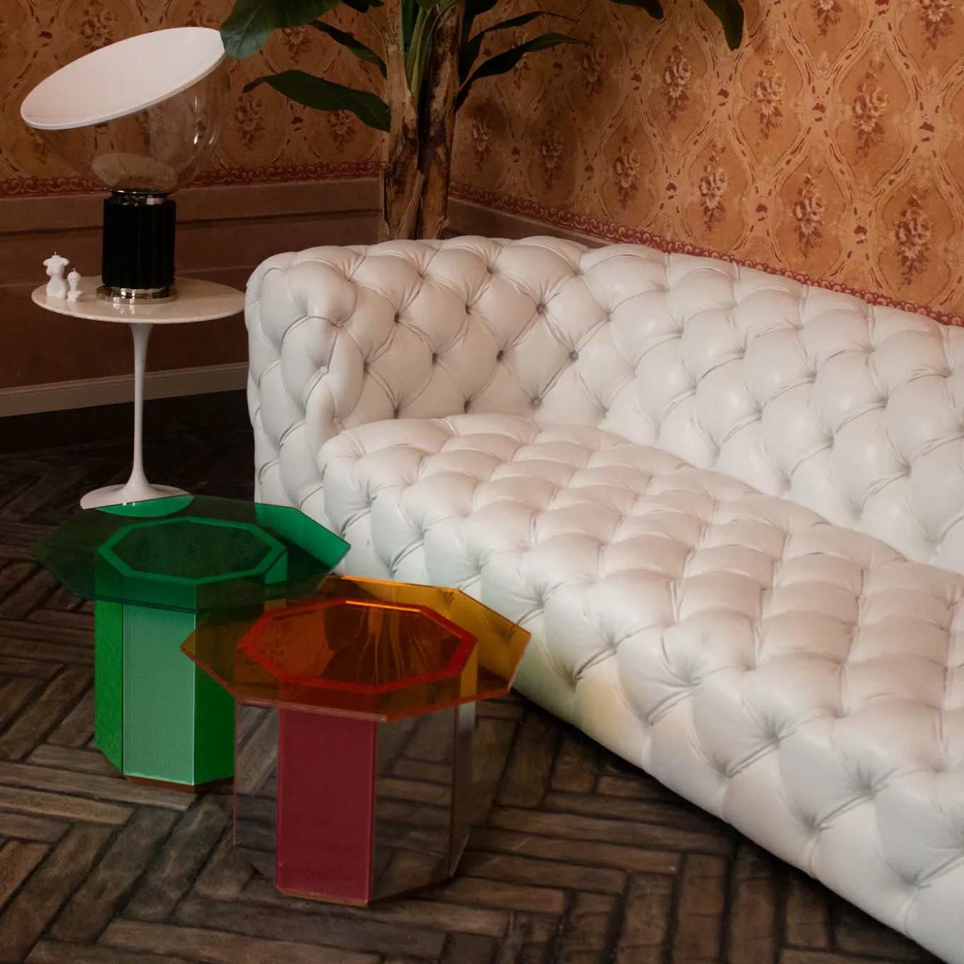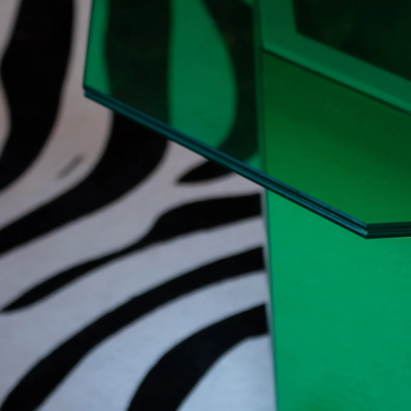 A vibrant objet d’art that will make a dynamic statement in any modern room, and can be matched with other elements from the same Series. This dazzling petite side table features a green-hued, glass-covered wood octagonal base along with a green mirrored-glass, irregular octagon top. Measures 50x50x35cm.