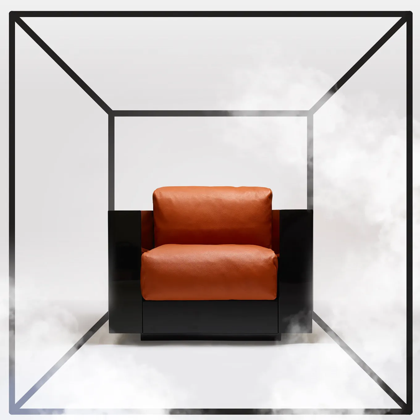 Distinguished by an elegant character reminiscent of a luxurious automobile in the choice of finishes, this magnificent armchair belongs to an exquisite series of seating solutions designed by Lella and Massimo Vignelli. Boasting clean and essential lines of rigorous profile, the structure is made of wood and finished with a shiny black polyester lacquer. The seat and back cushion are thickly padded with feathers and upholstered in refined orange leather.