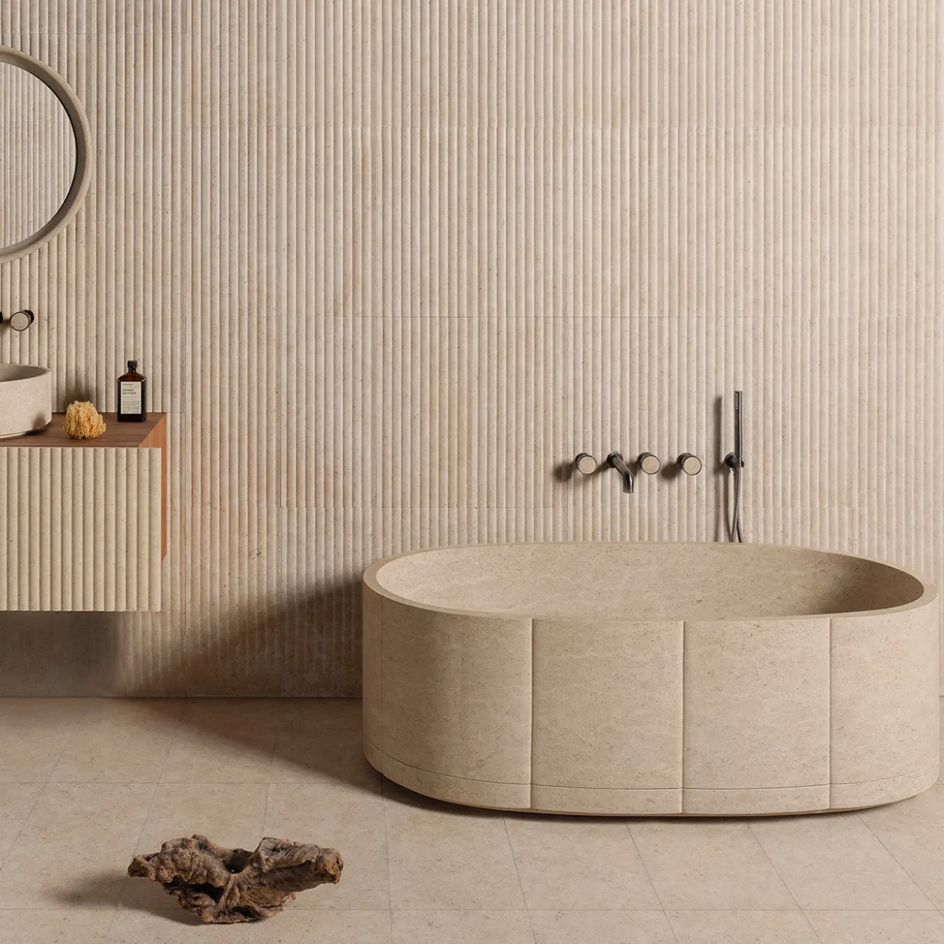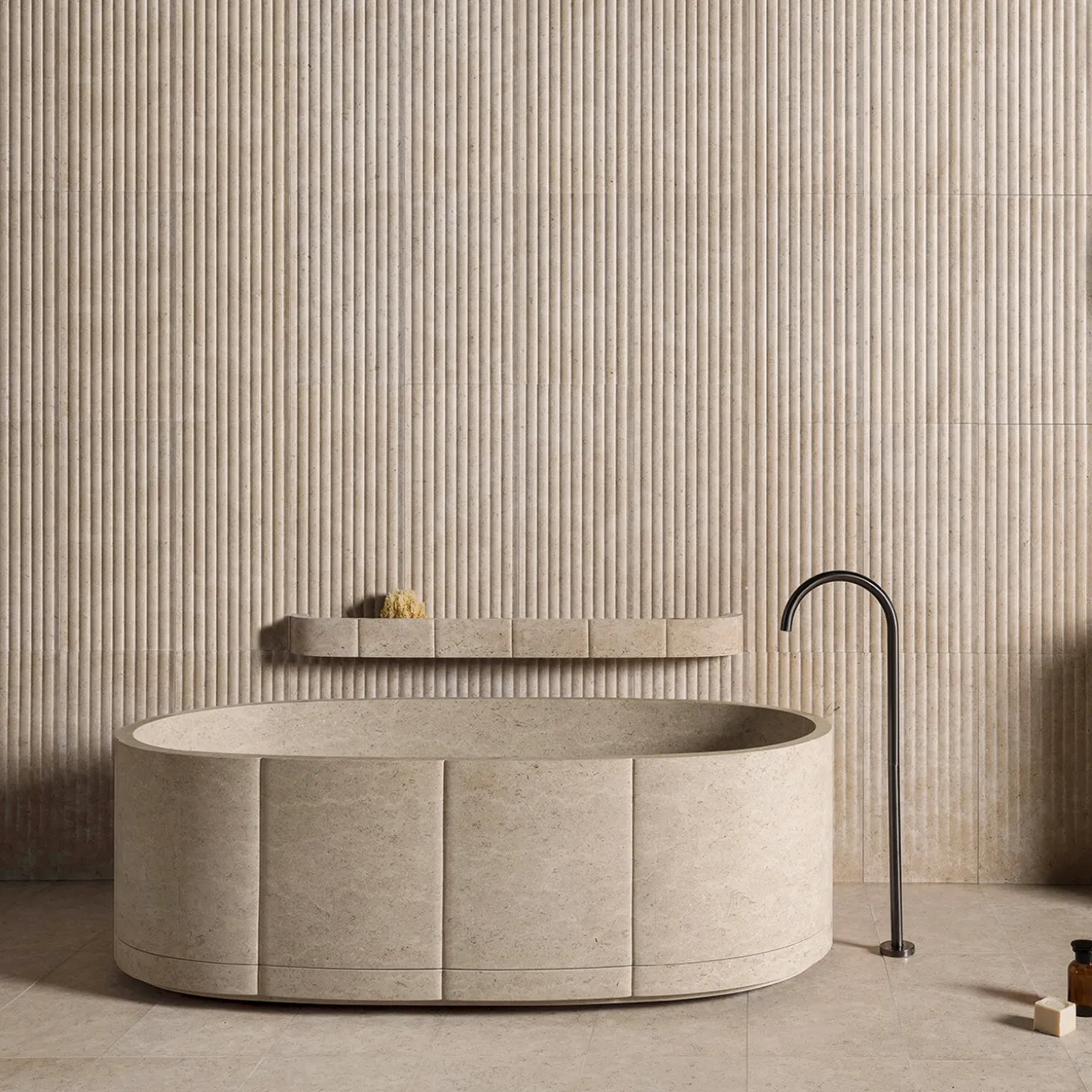The Sartoriale bathtub features a distinctive outer texture that enhances its soft visual appeal. Its glossy inner surface ensures a smooth transition between vertical walls and the horizontal base, emphasizing refined elegance. A continuous vertical line runs around the perimeter, creating a subtle “V”-shaped design visible from above. The ergonomic oval shape gently embraces the user, elevating everyday bathing into a personalized and harmonious marble setting.