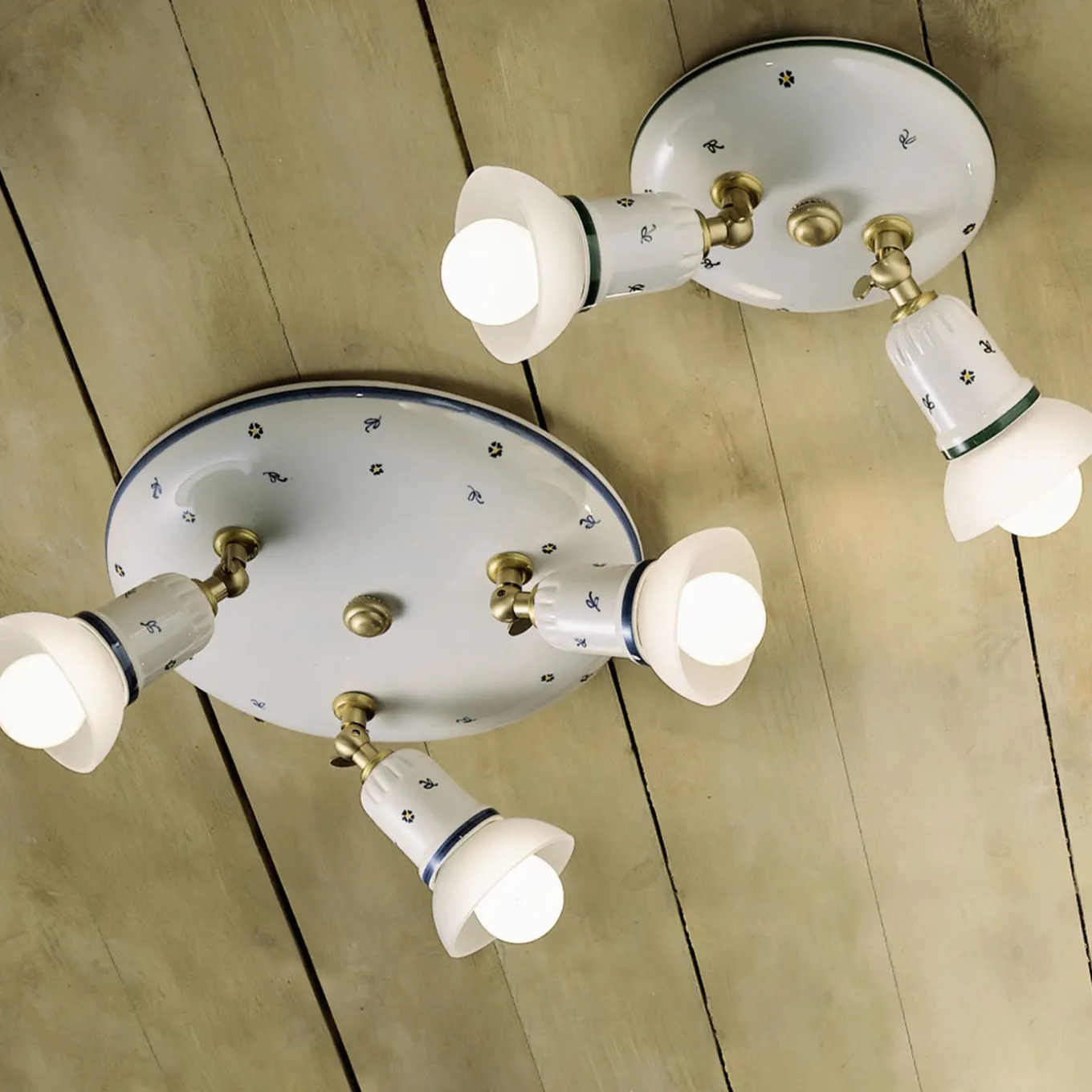 A practical and elegant lighting piece, this ceiling lamp is composed of two adjustable spotlights holding an E14 bulb. Diffusing a direct yet warm light, each spotlight features a satin glass shade mounted on a white ceramic structure hand-painted in a floral green motif and enriched with satin brass details.